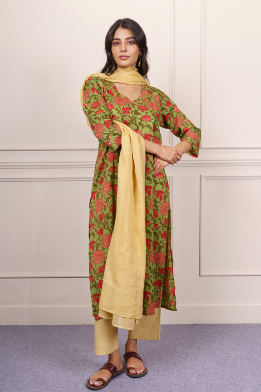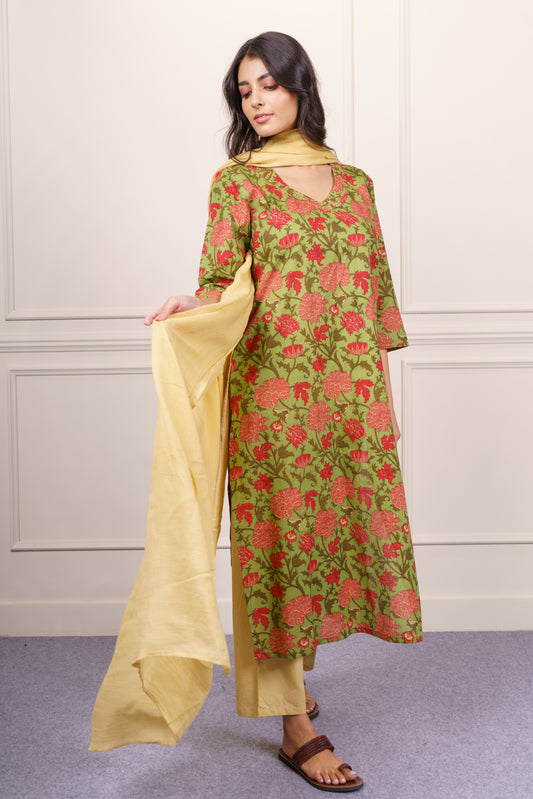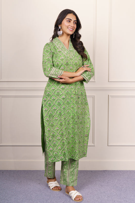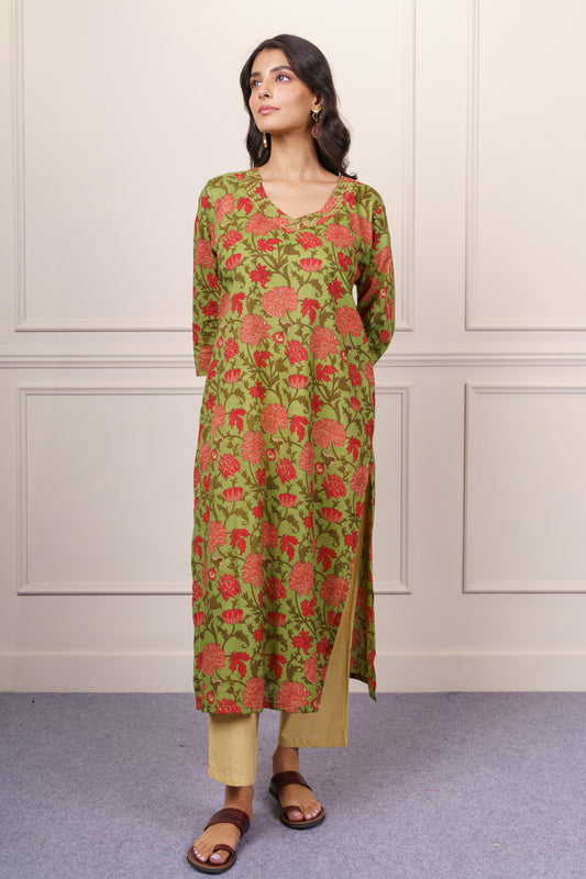 Green Hand Block Printed Cotton Kaftan -NVK543