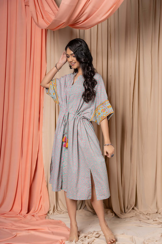 ICE GREEN BLOCK PRINTED COTTON KAFTAN-NVK332