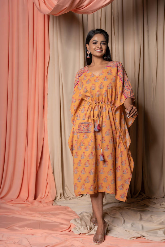 GOLDEN APRICOT BLOCK PRINTED COTTON KAFTAN-NVK339