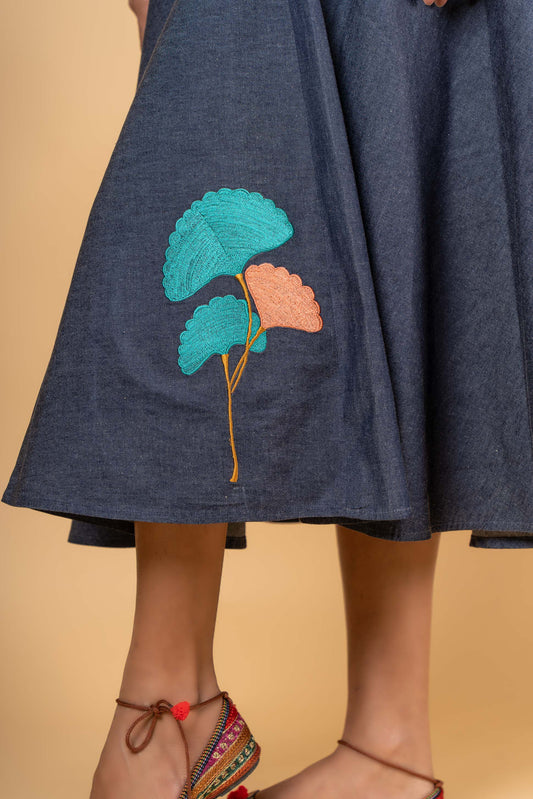 DENIM EMBROIDERED FLAIRED SKIRT-NFB05
