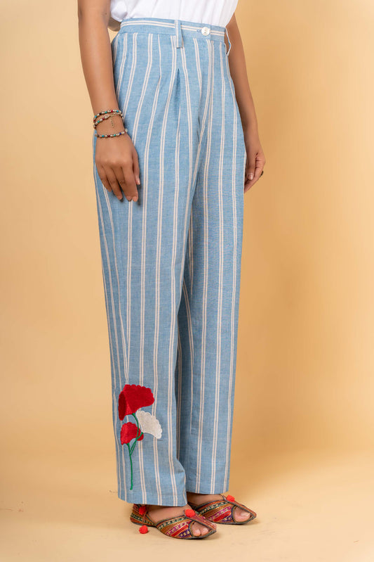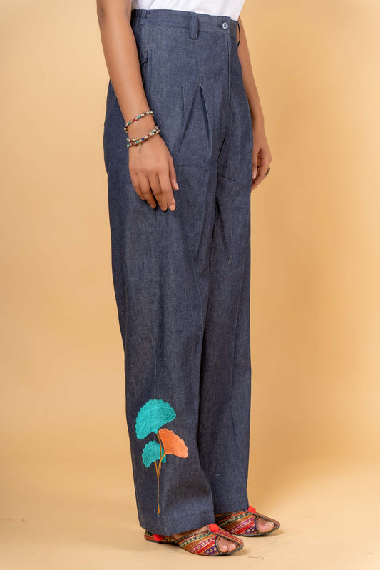 BLUE KHARI COTTON EMBROIDERED HIGH WAIST PANT-NFB23