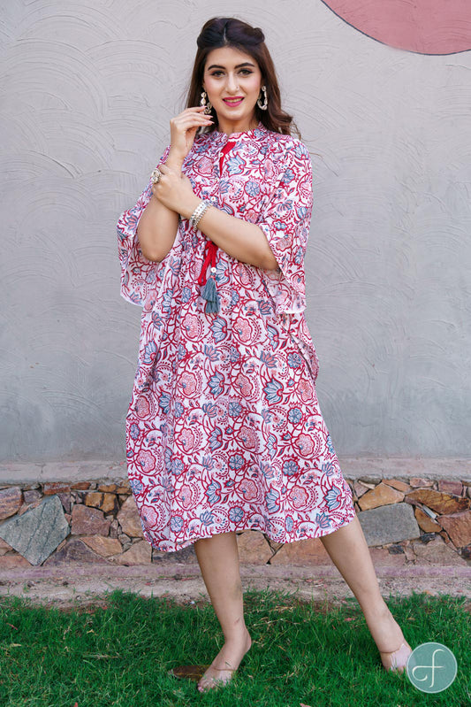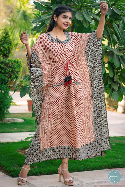 BAGRU RED BLOCK PRINTED COTTON KAFTAN DRESS-NVK168