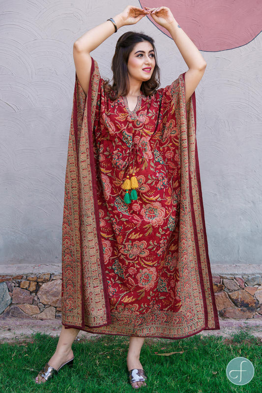 Brick Red Floral Block Print Cotton Kaftan-NVK208