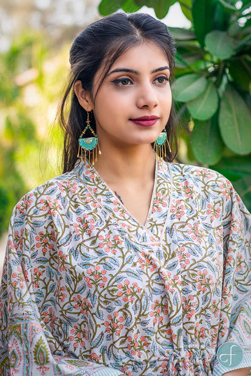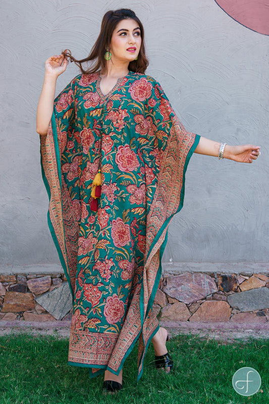 PINE GREEN FLORAL BLOCK PRINT COTTON KAFTAN-NVK206
