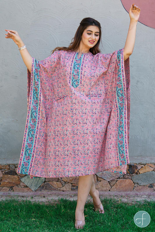 PINK AND BLUE FLORAL BLOCK PRINT KAFTAN DRESS-NVK204