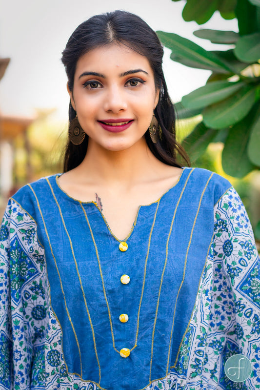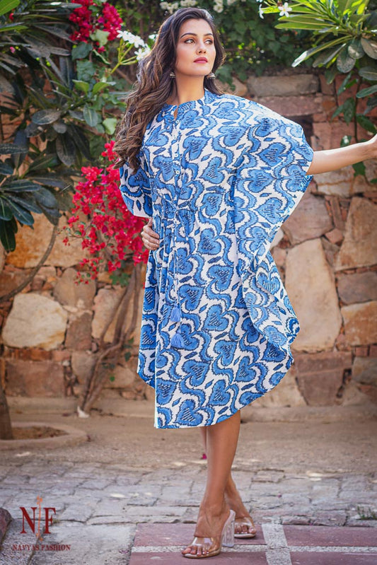 BLUE BLOCK PRINTED COTTON KAFTAN DRESS-NVK172