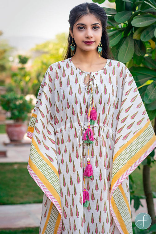 WHITE BLOCK PRINTED COTTON KAFTAN DRESS-NVK161