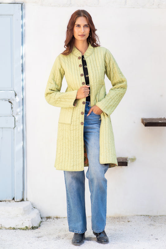 Green Yellow Folded Sleeves Quilted Coat-NVQJ632