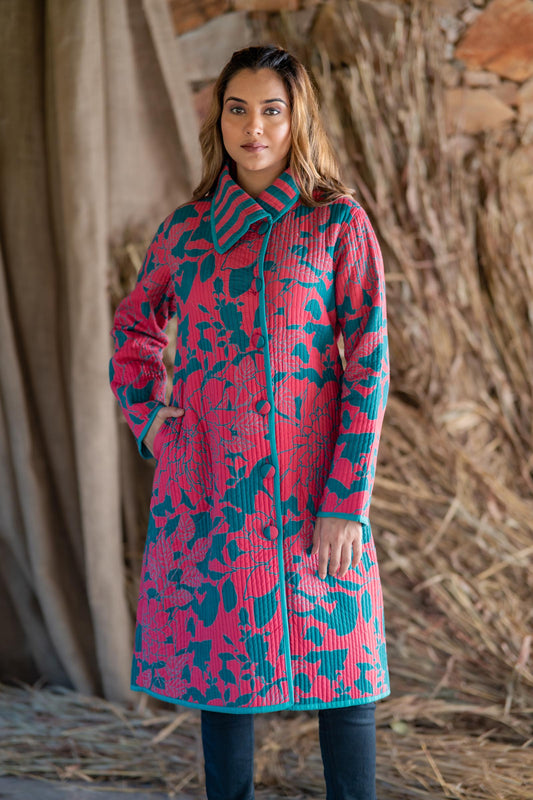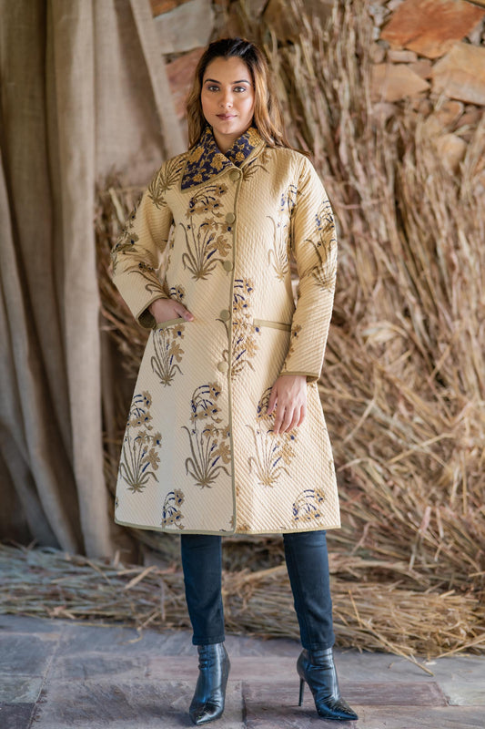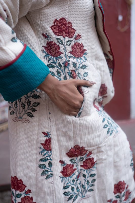 Floral Block Printed Waffle Quilted Coat-NVQJ640
