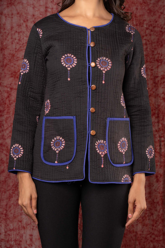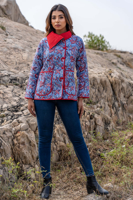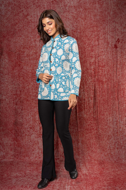 Blue Floral Block Print Quilted Bukhara Jacket- NVQJ350