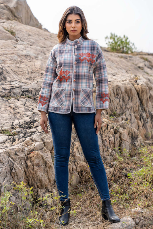 Grey Checks Quilted Embroidered Jacket- NVQJ345
