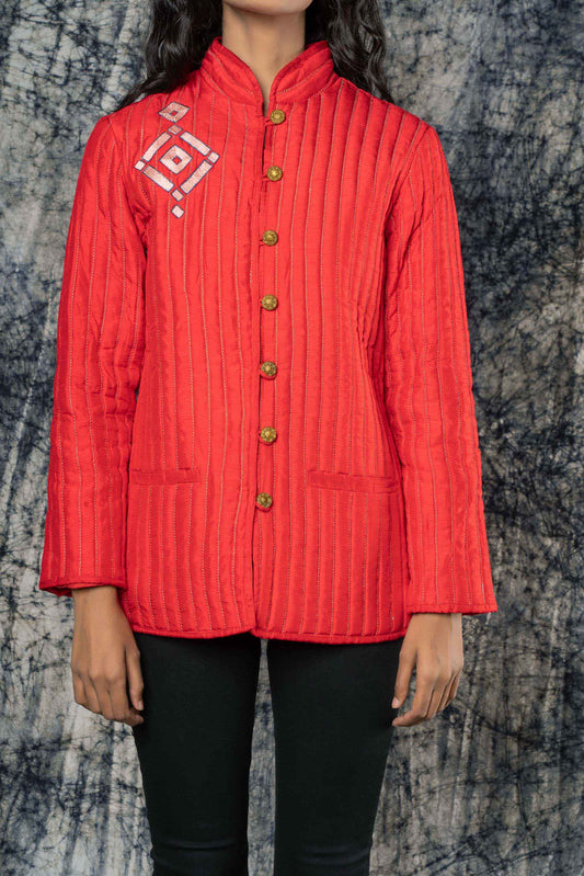 Red Embroidered Dola Silk Quilted Jacket-NVQJ378
