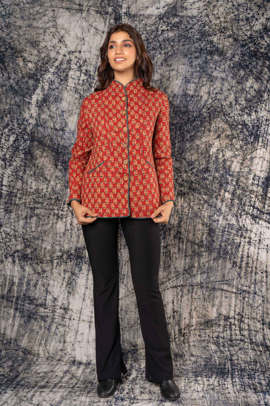 Red Block Printed Cotton Quilted Jacket-NVQJ380