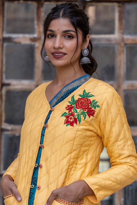 Sunshine Yellow Embroidered Quilted Silk Jacket- NVQJ308