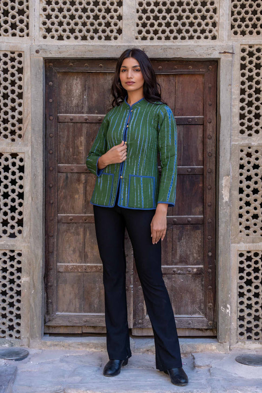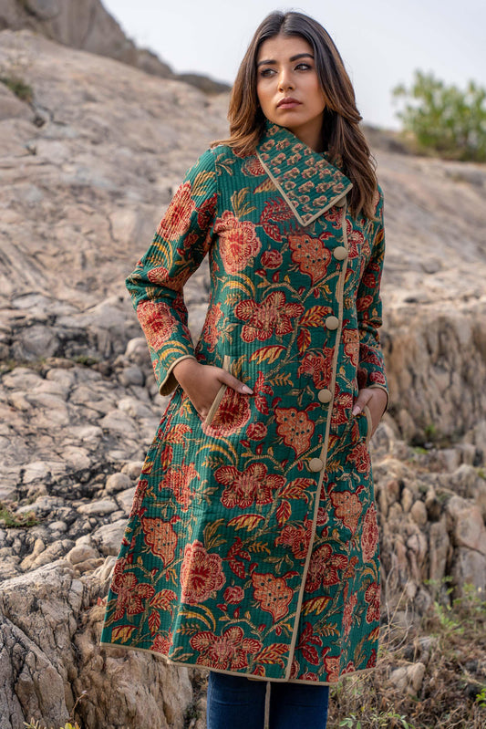 Green Floral Block Printed Quilted Bukhara Coat-NVQJ330
