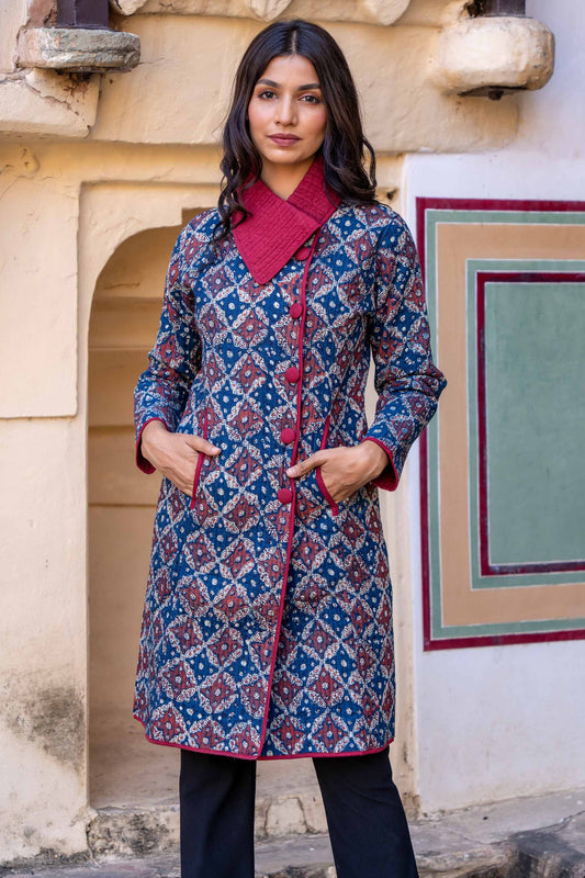 Ajrakh Blue Block Printed Quilted Bukhara Coat-NVQJ318