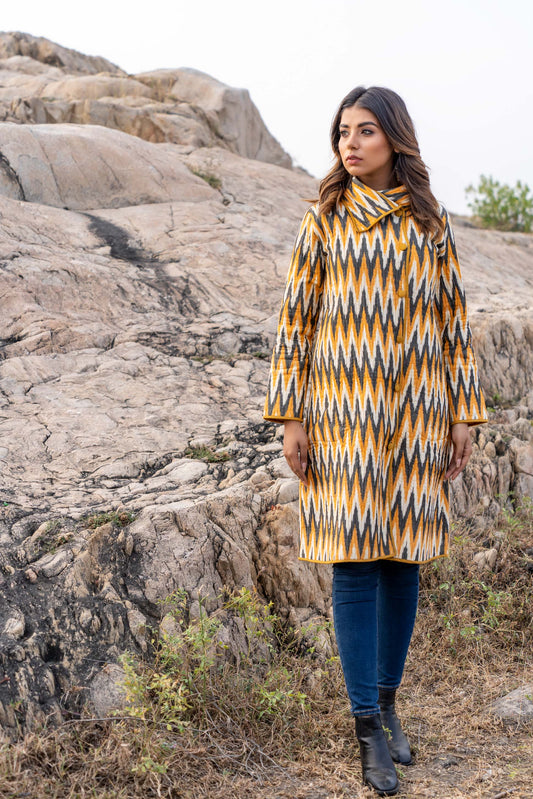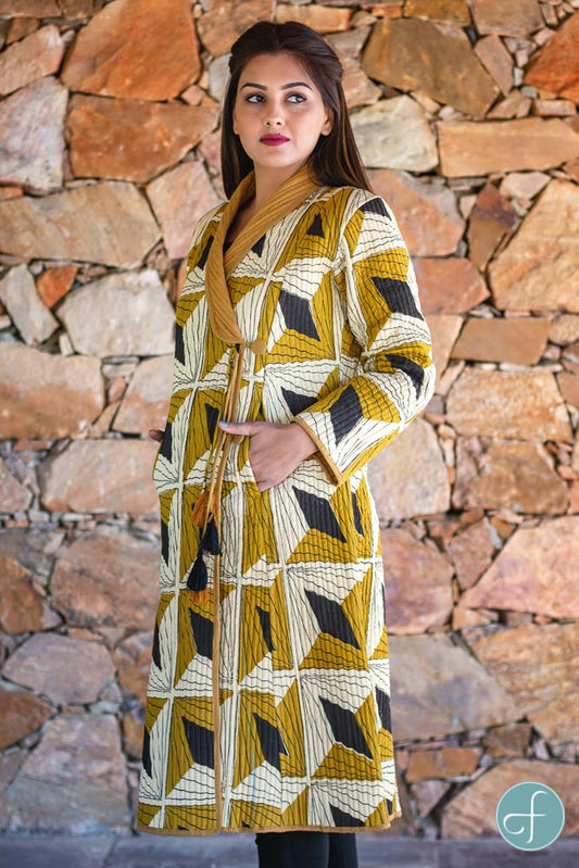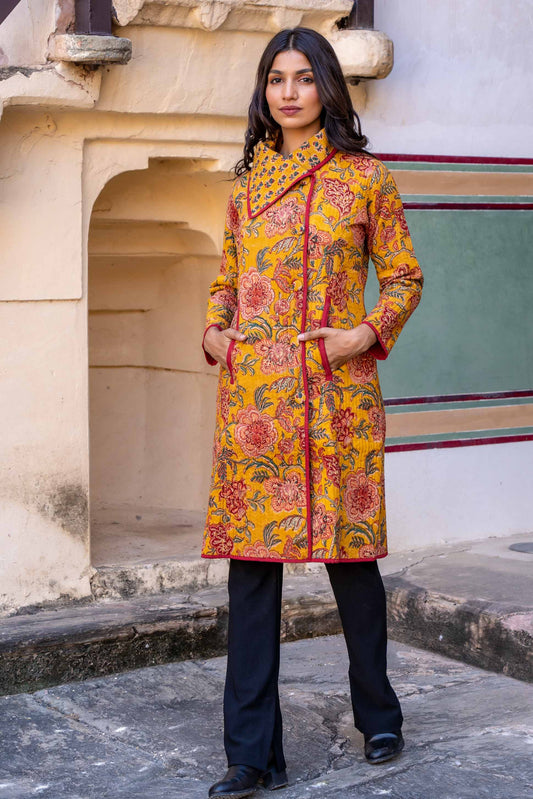 Golden Mustard Block Printed Quilted Bukhara Coat-NVQJ316