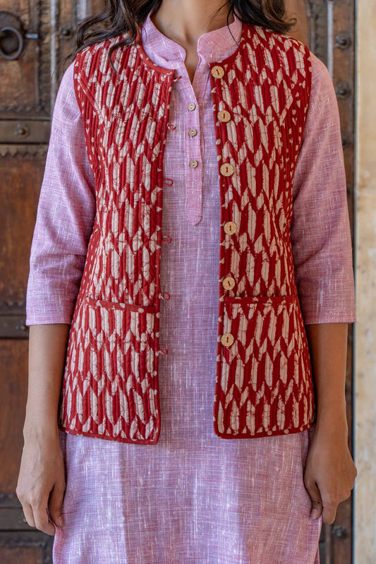 Bagru Red Reversible Cotton Quilted Sleeveless Jacket- NVQJ311