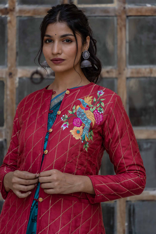 Berry Red Embroidered Quilted Silk Jacket- NVQJ307