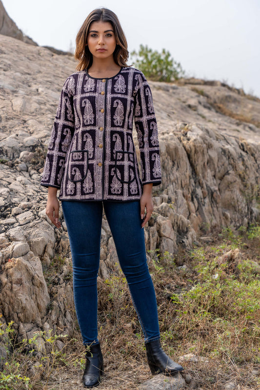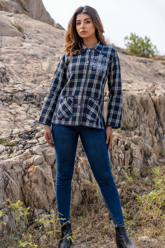 Blue Checks Quilted Embroidered Jacket- NVQJ343