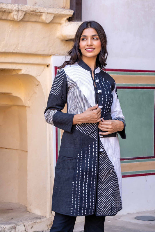Black White Patch Work Quilted Long Coat-NVQJ319