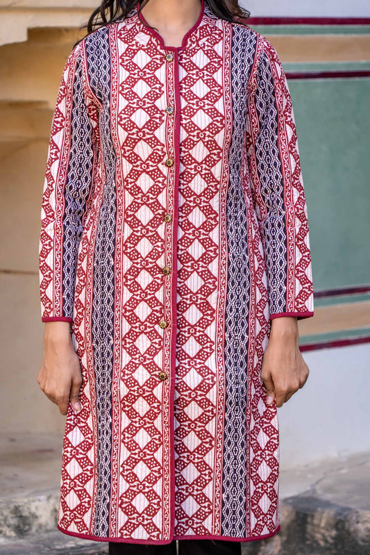 Natural Red Block Printed Quilted Bukhara Coat-NVQJ317