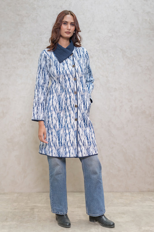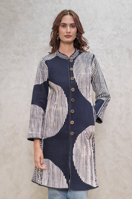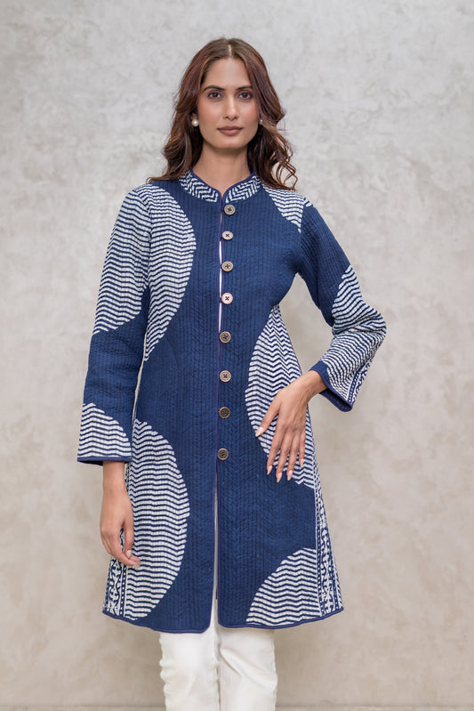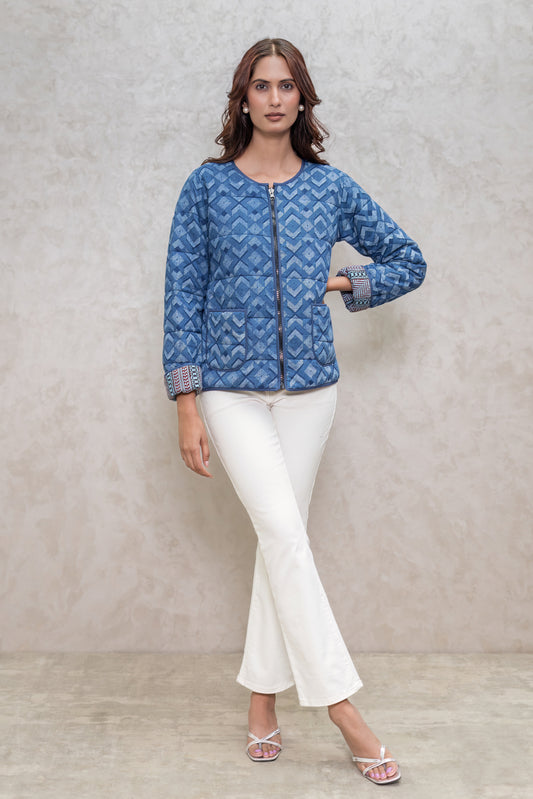 Indigo Block Printed Fiber Quilted Jacket-NVQJ602