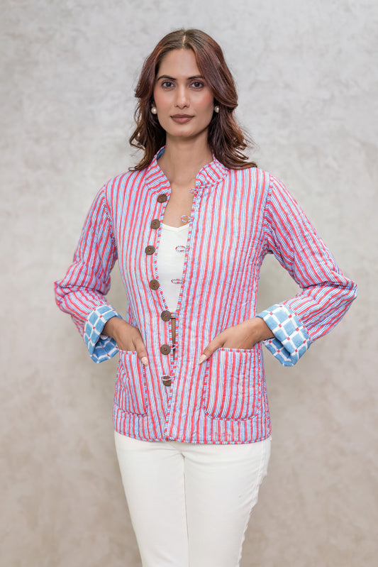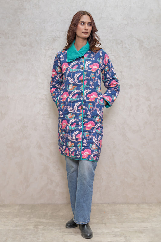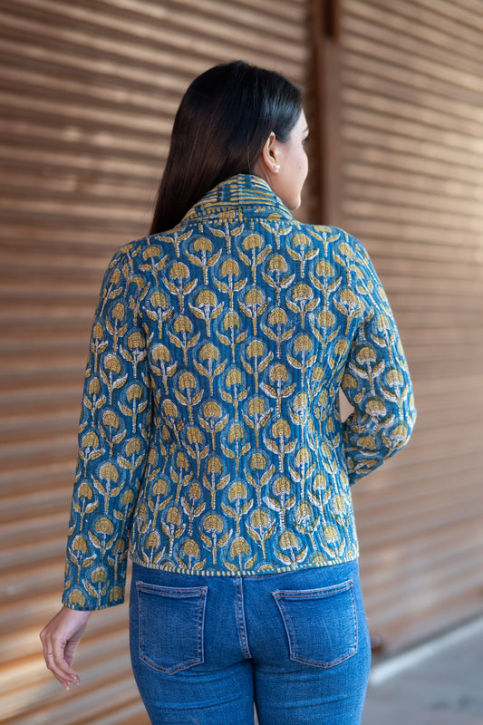 Blue Reversible Block Printed Quilted Jacket-NVQJ601