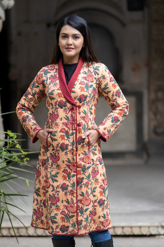 Red Floral Block Printed Quilted Bukhara Coat-NVQJ357