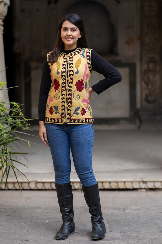 Suzani Embroidered Reversible Beige Jacket-NVQJ590