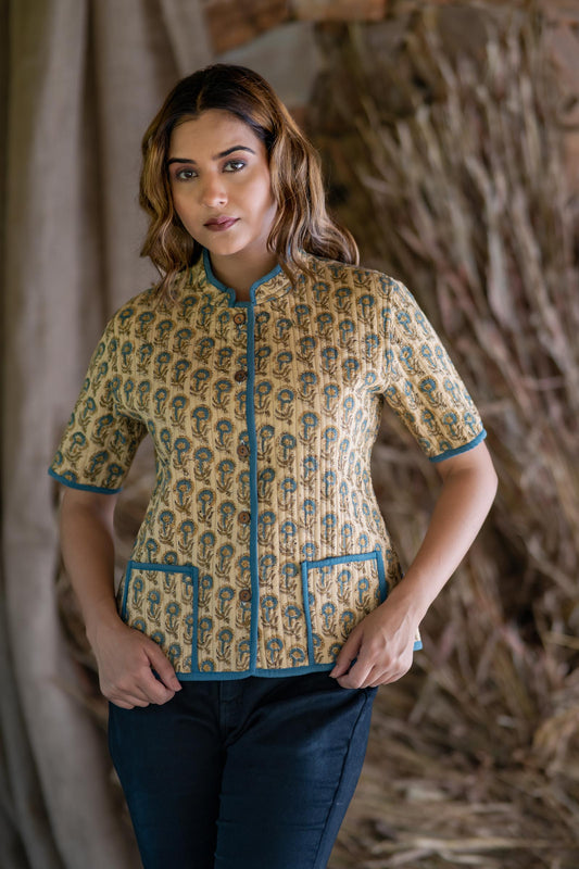 Floral Block Printed Quilted Short Jacket- NVQJ478