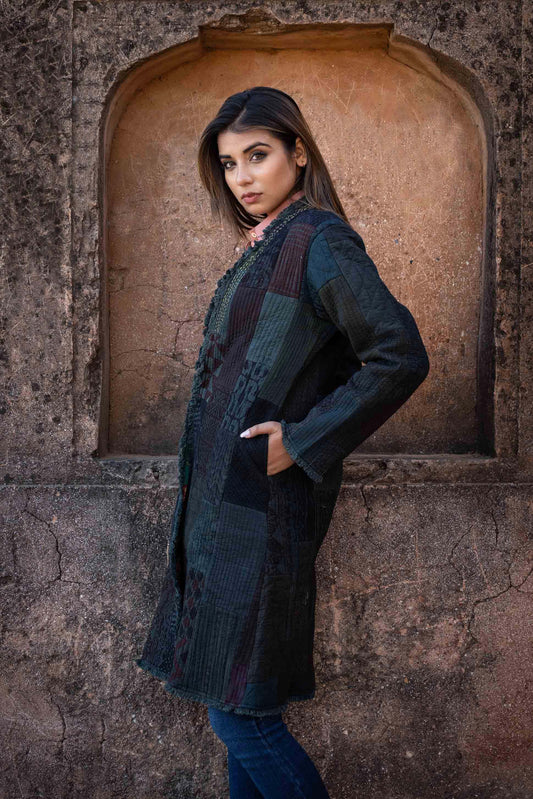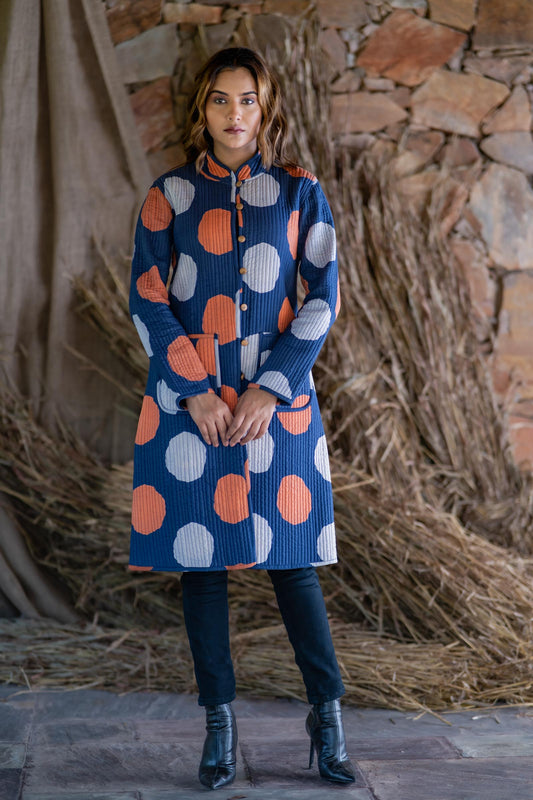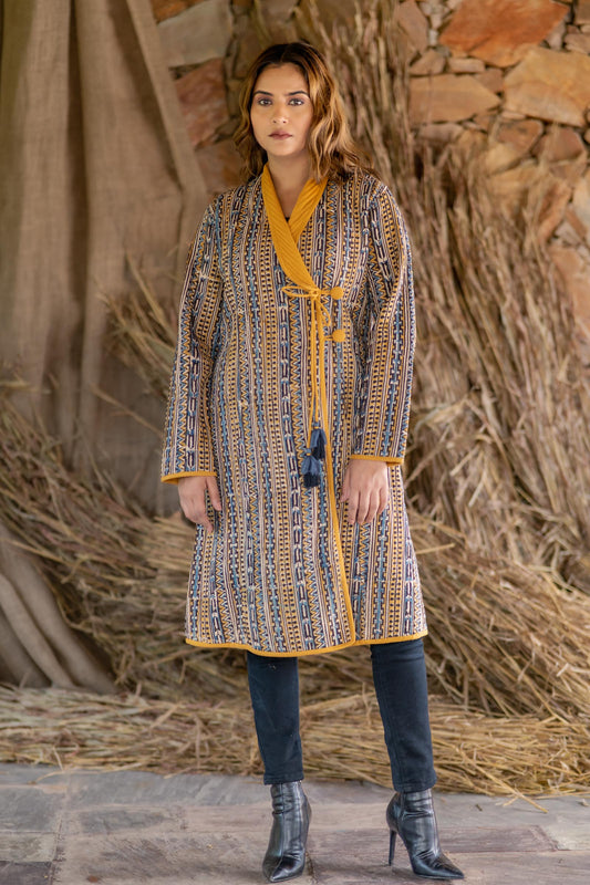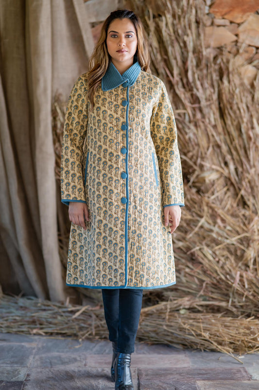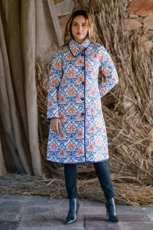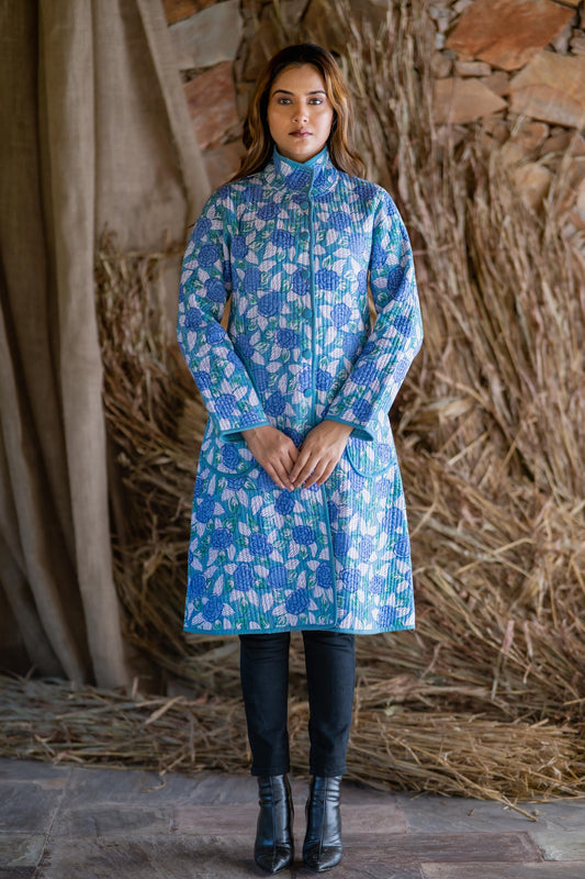 Blue Block Printed Bordered Quilted Coat- NVQJ484