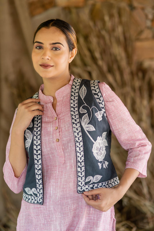 Black Embroidered Sleeveless Jacket- NVQJ467