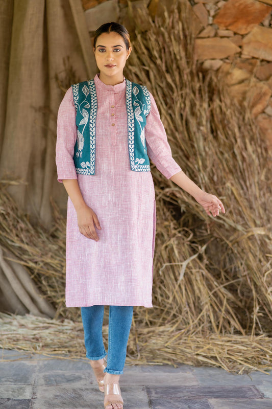 Teal Green Embroidered Sleeveless Jacket- NVQJ466