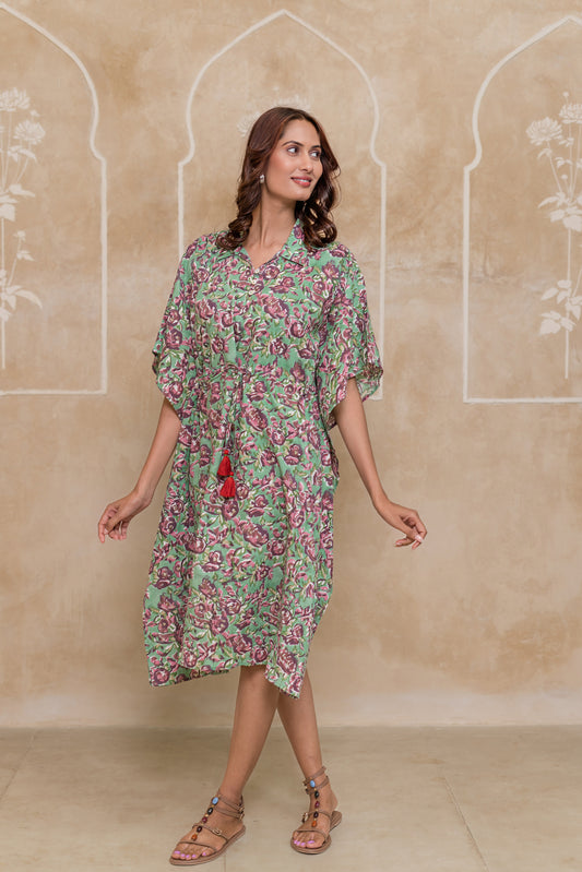 Green Hand Block Printed Cotton Kaftan -NVK543