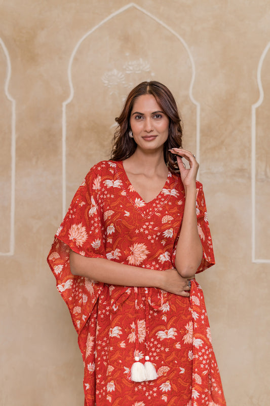 Pink Red Block Printed Cotton Kaftan -NVK546