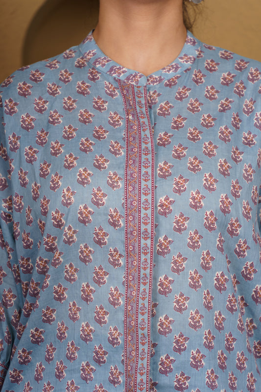 Powder Blue Printed High-Low Cotton Top-NFT156
