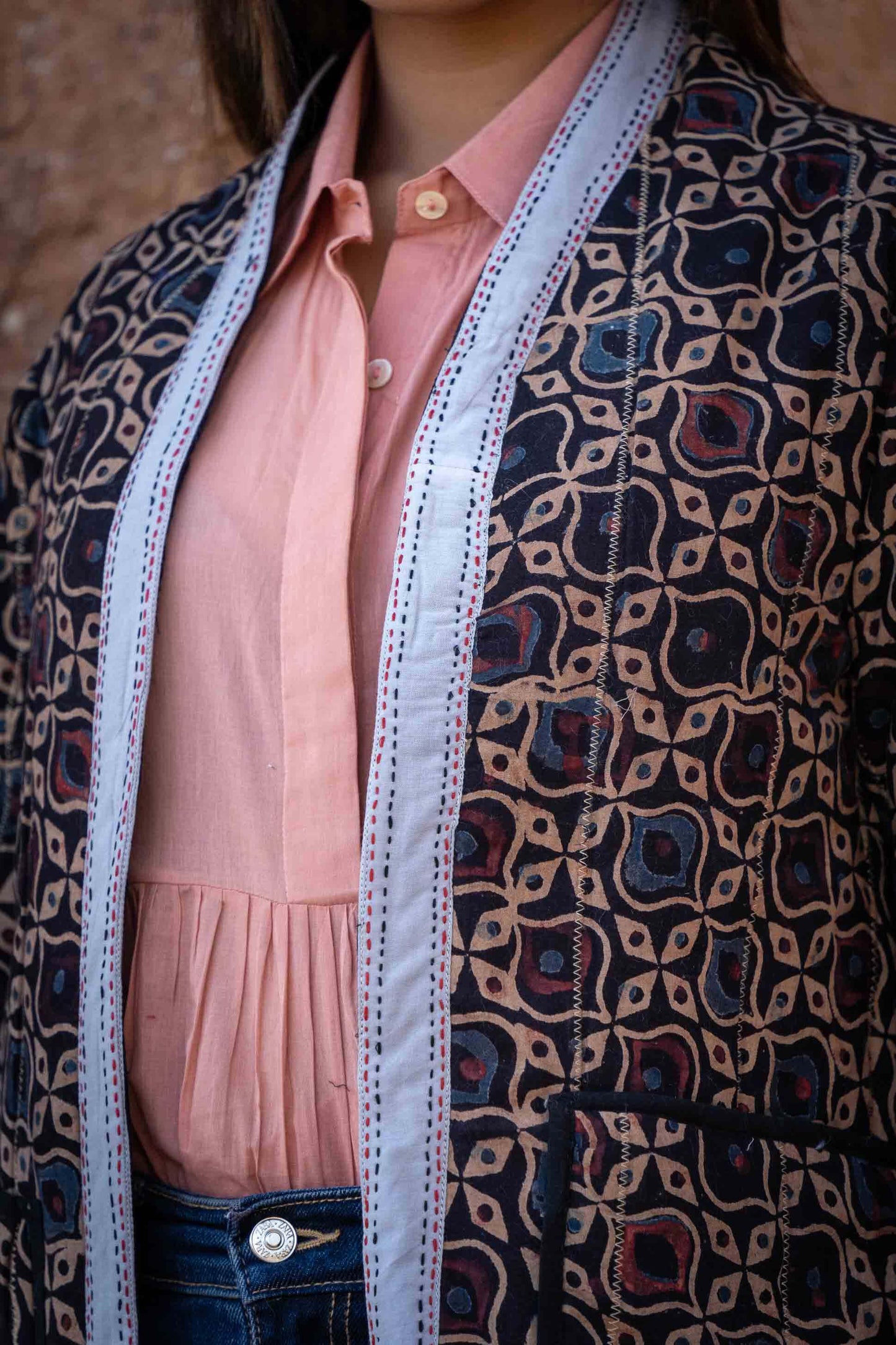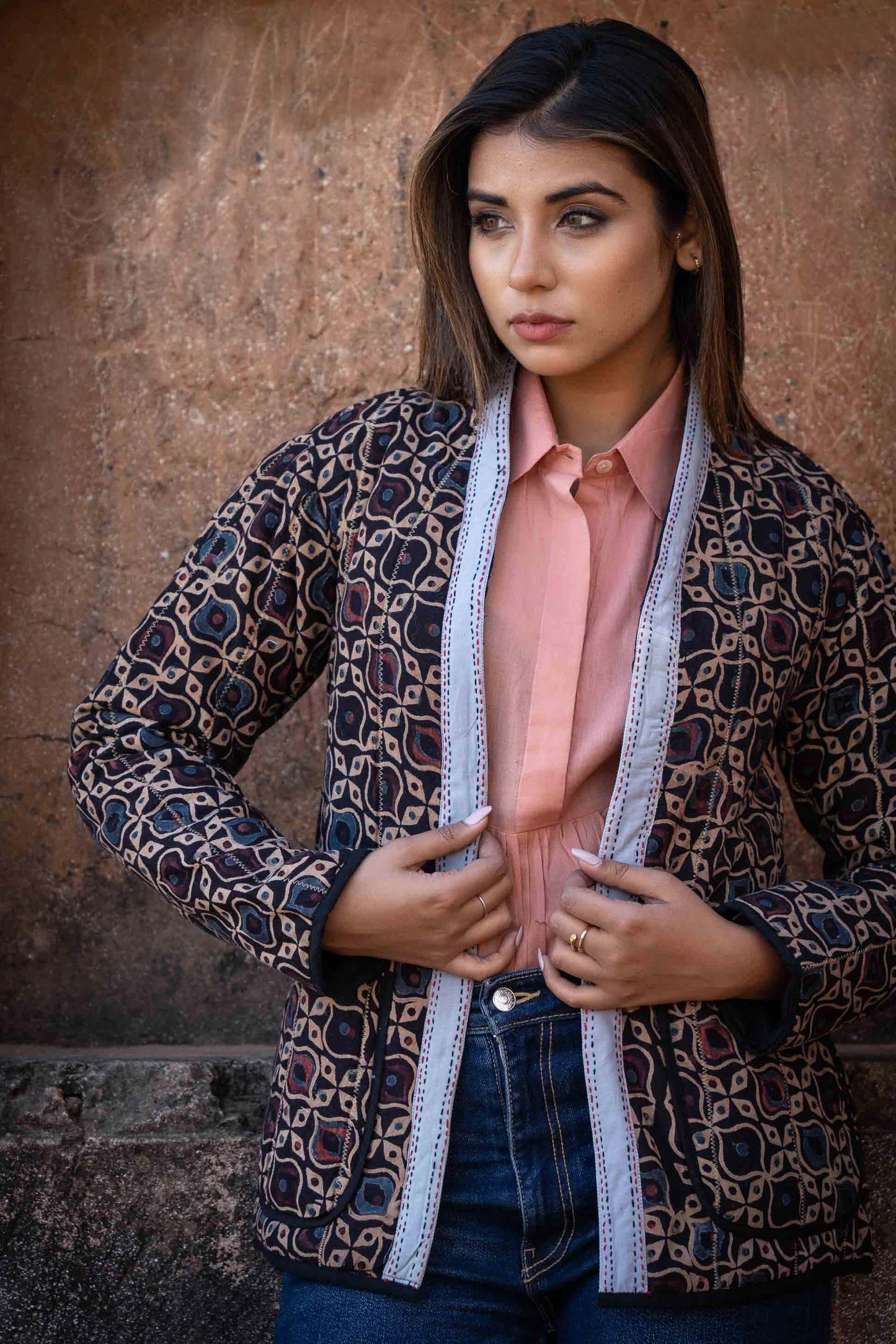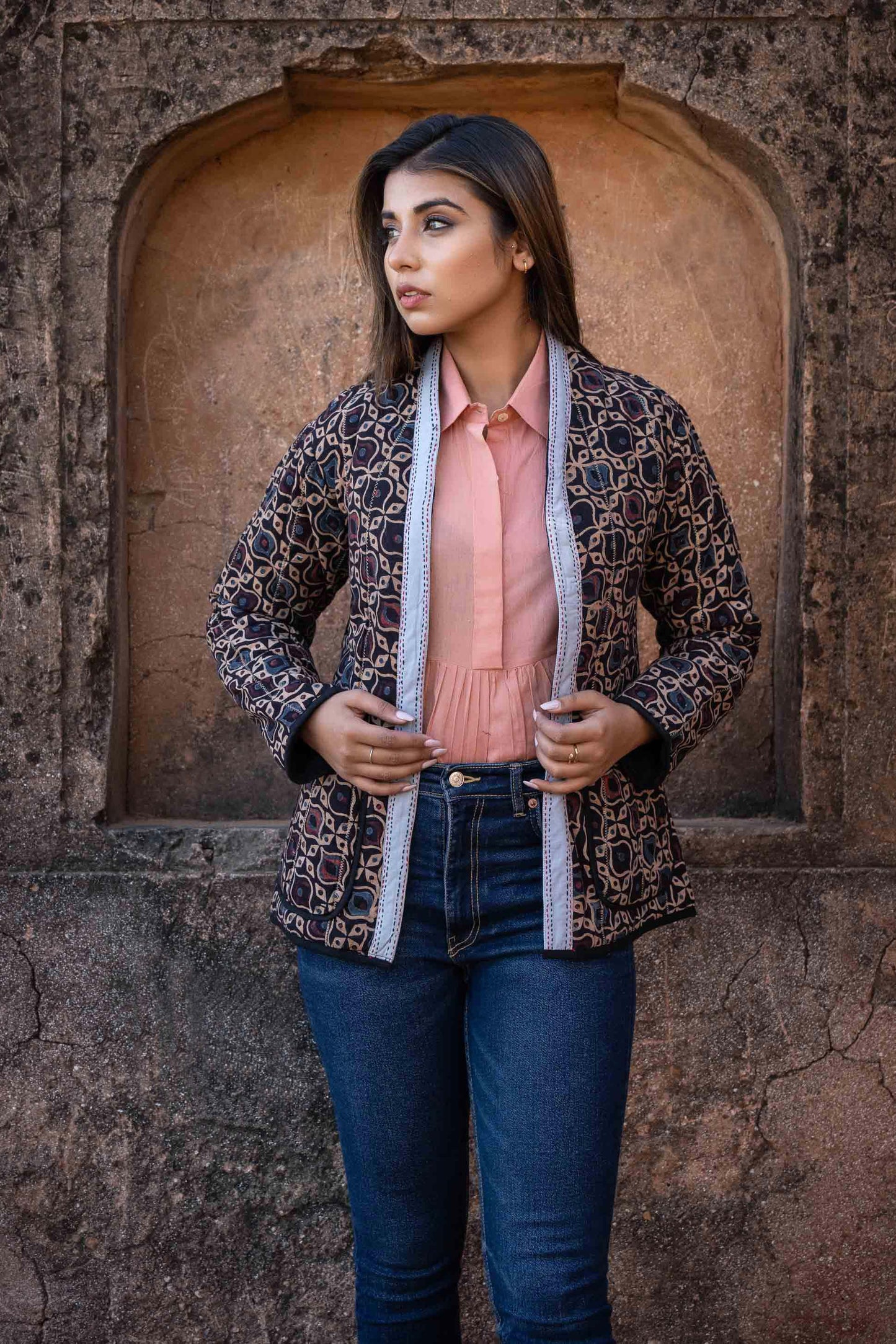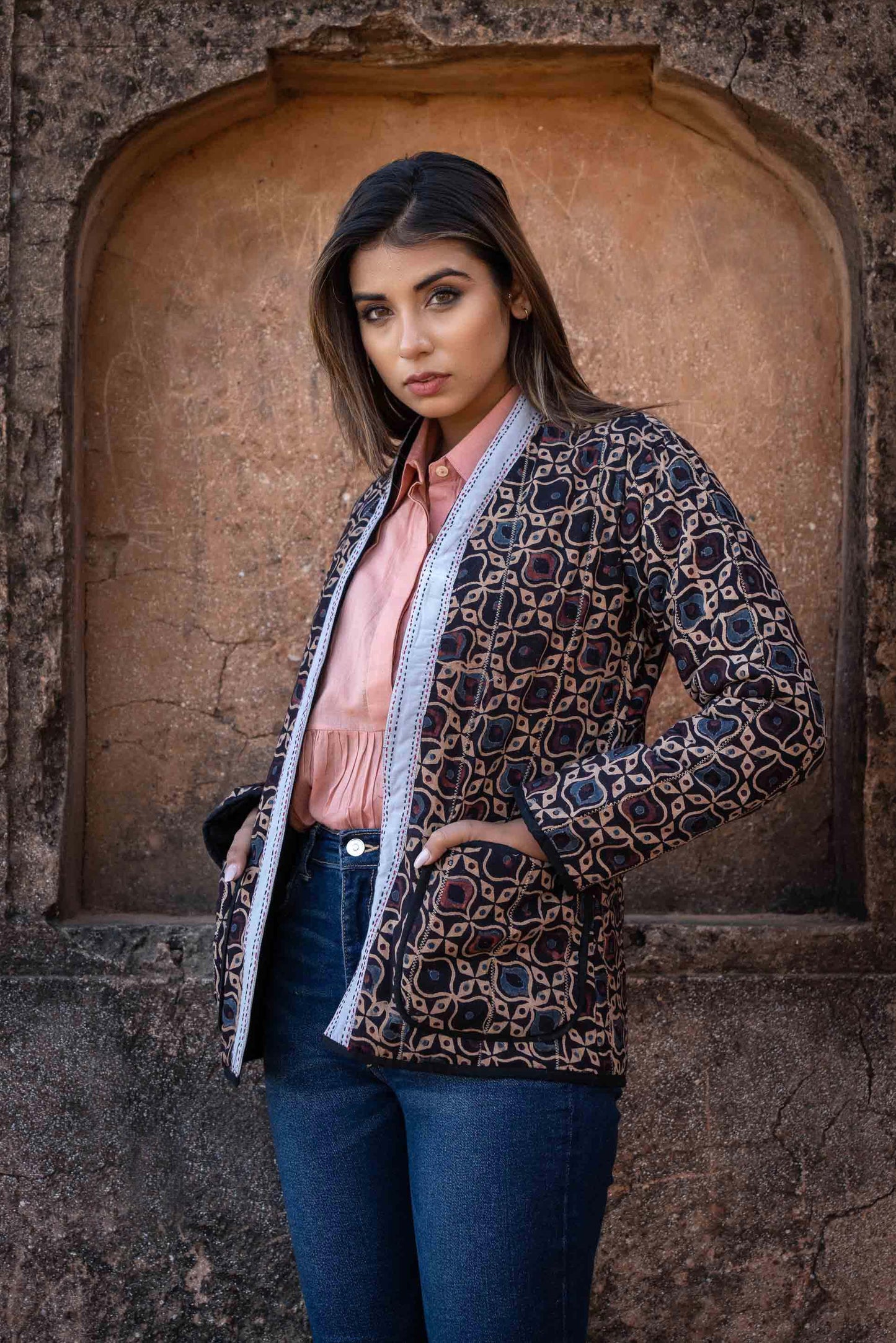100% Cotton ajrakh hand block printed puffer jacket with front pockets is a perfect choice for the winter season.