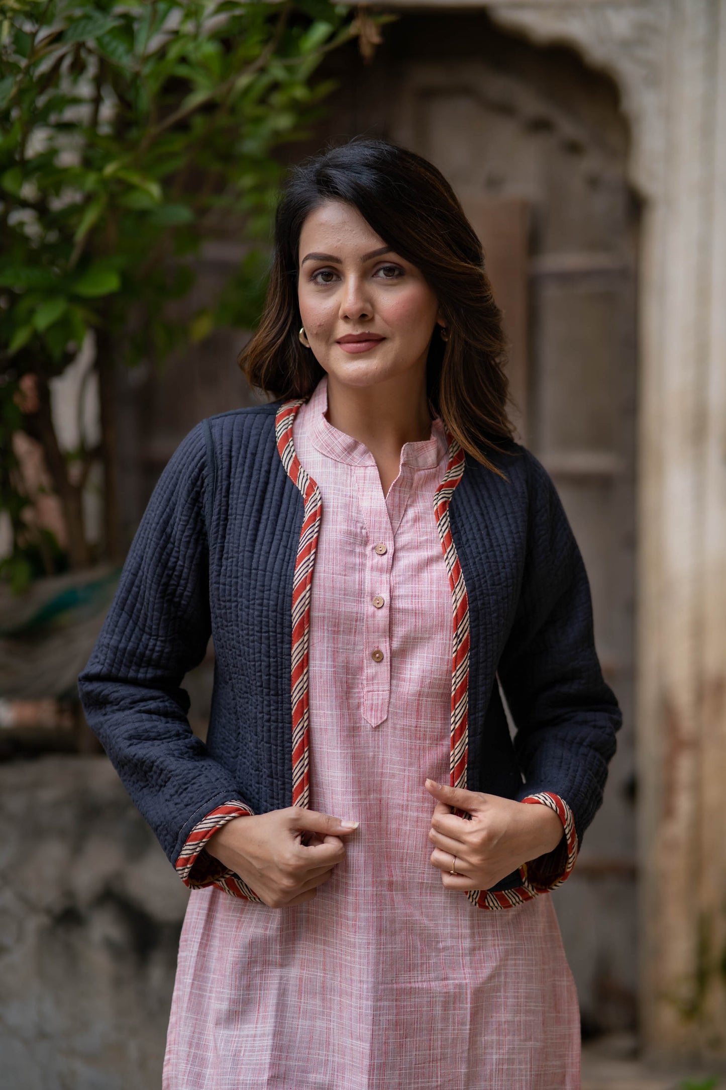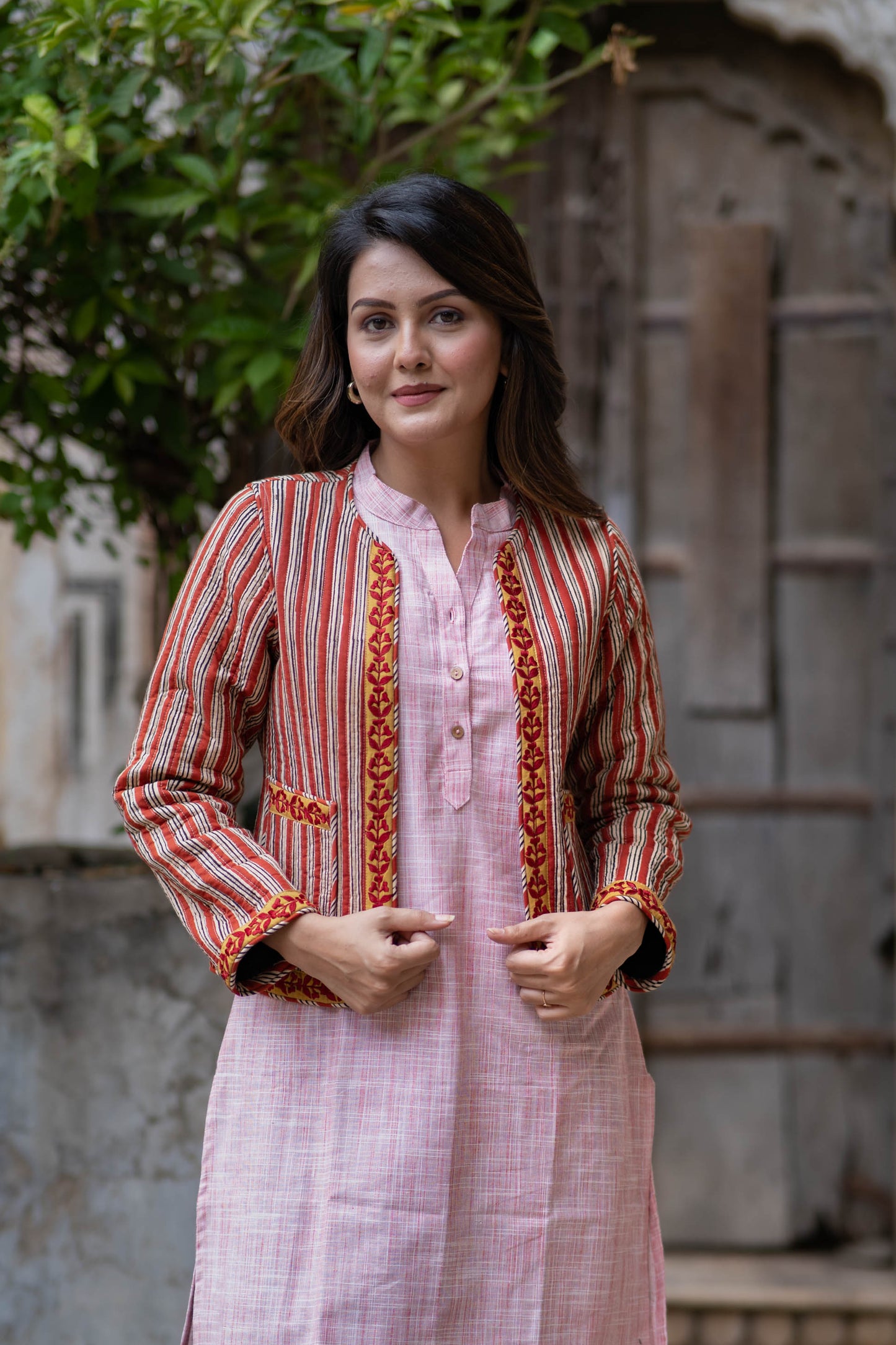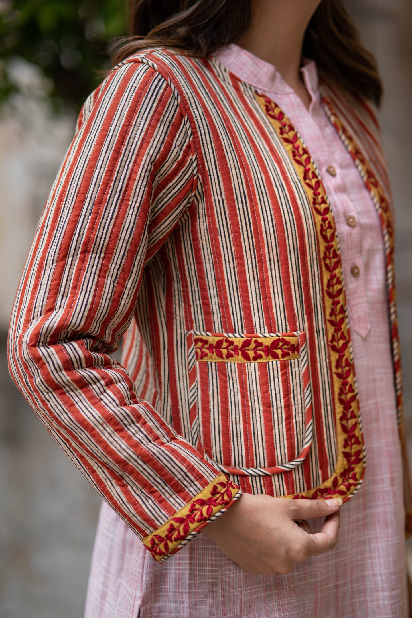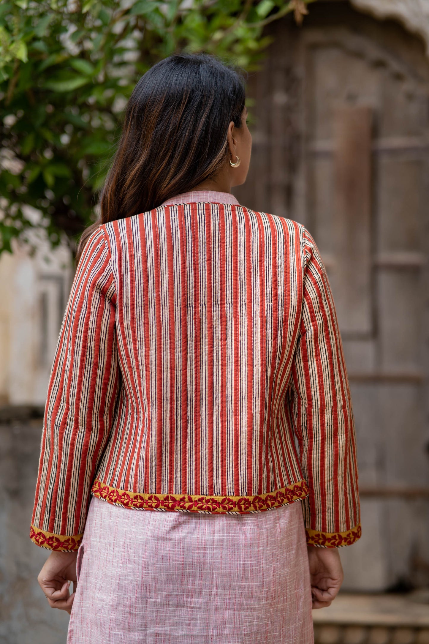 Bagru red hand block printed reversible quilted jacket for all the fashion lovers. Plain black color at the reverse side makes it wearable from both the sides.