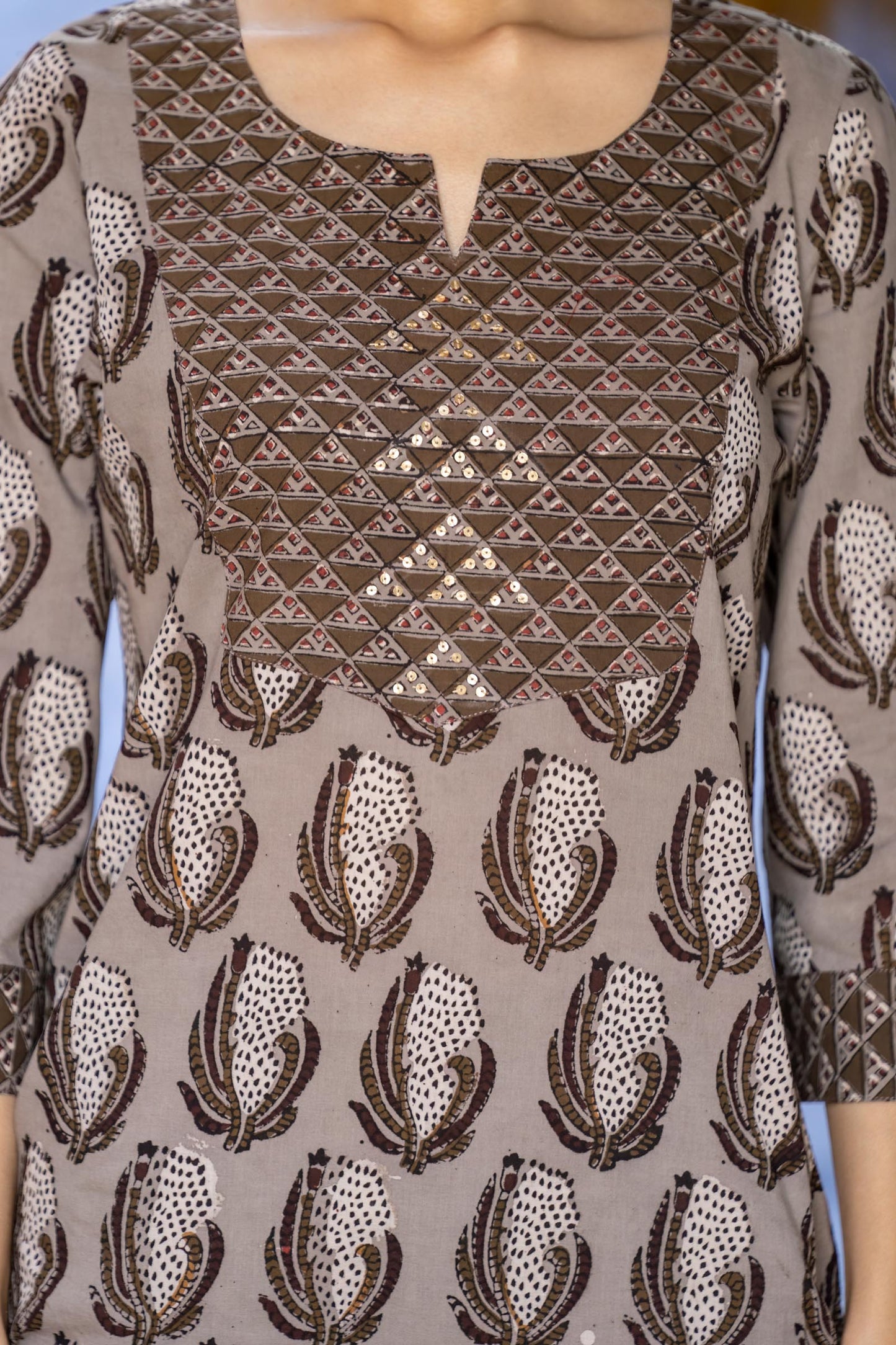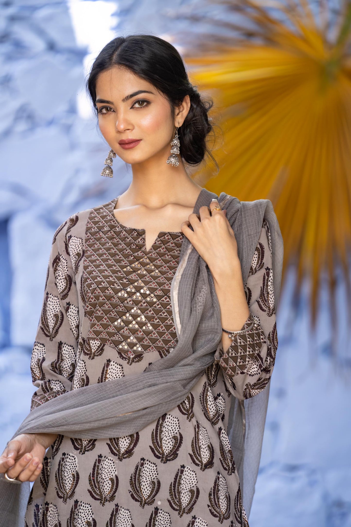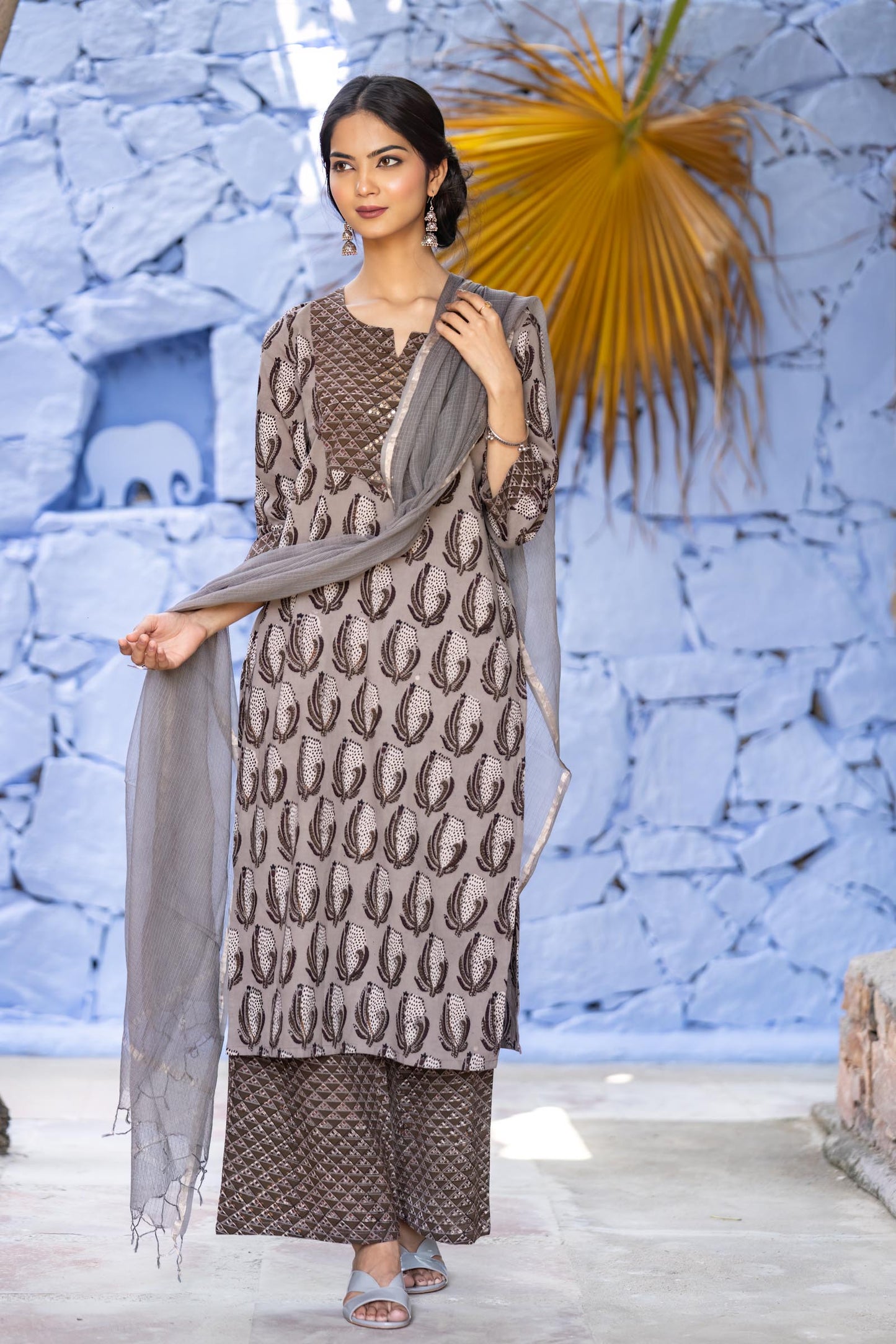 Three forth sleeves hand block printed bagru kurta dupatta pant set in cotton fabric.
