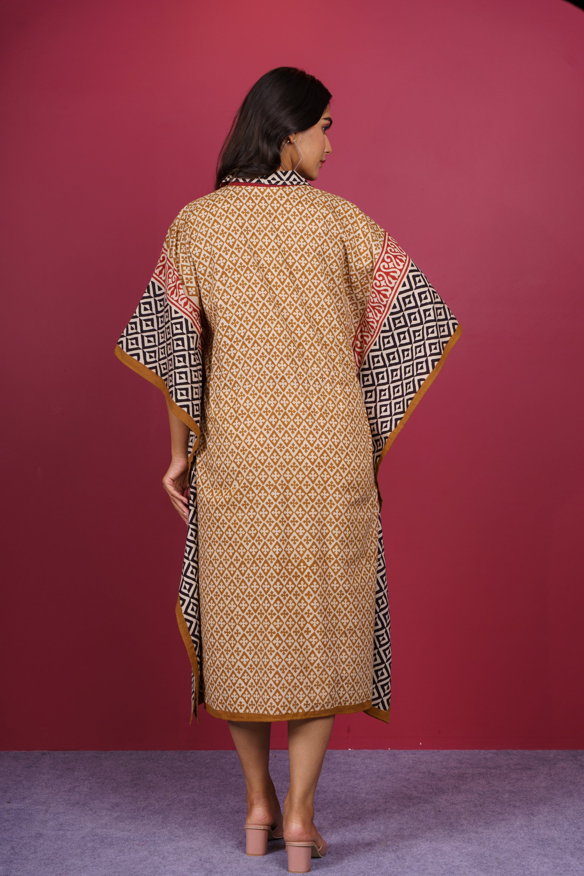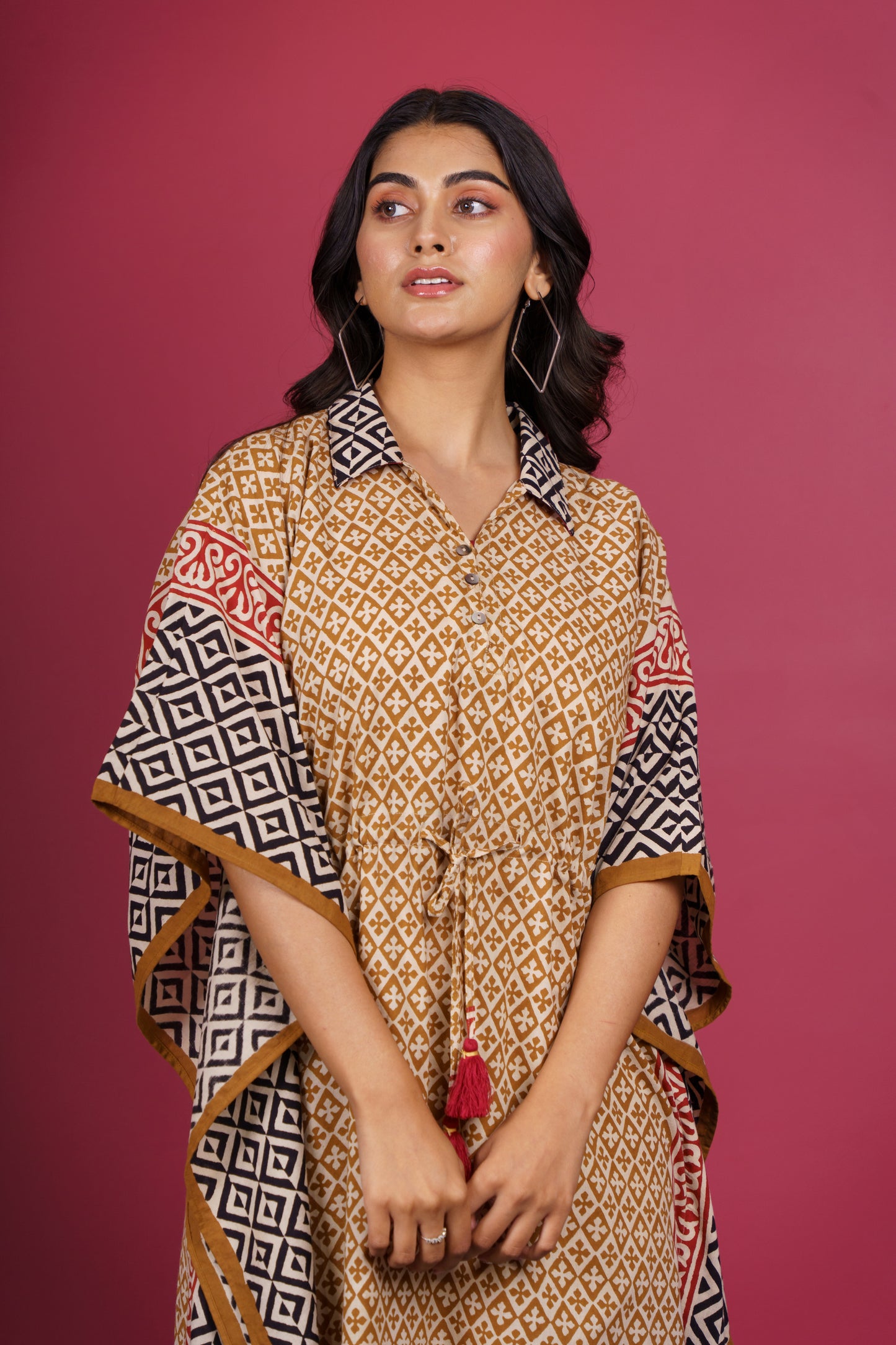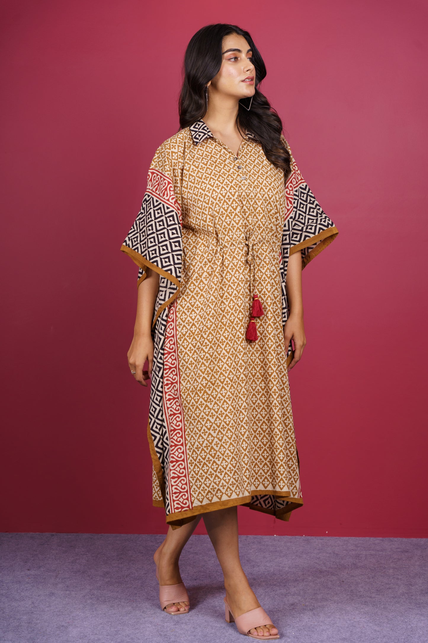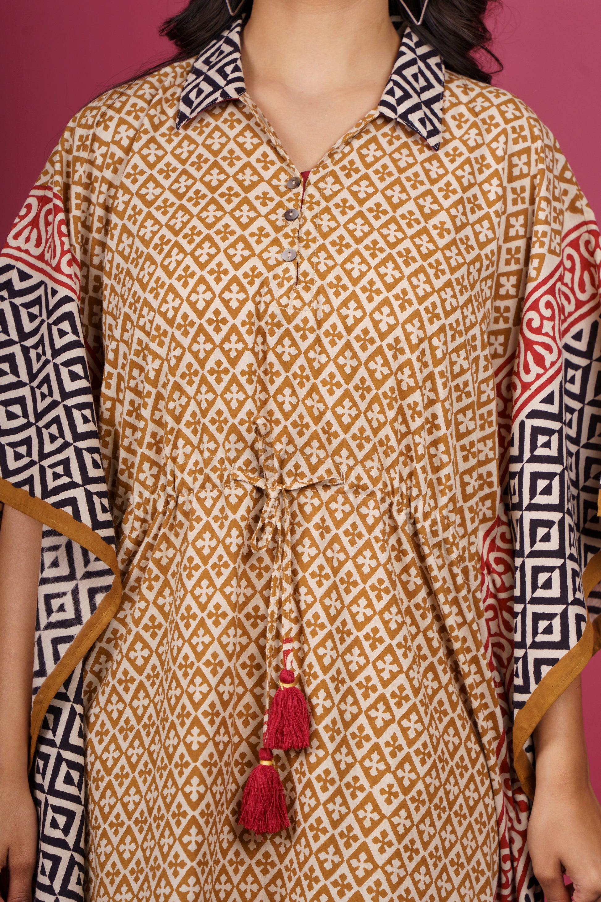 Bagru hand block printed knee length kaftan dress for this summer season. Floral hand block print makes it an elegant piece. The kaftan dress has drawstring with tassels to make adjustments at the waist giving it a trendy look.