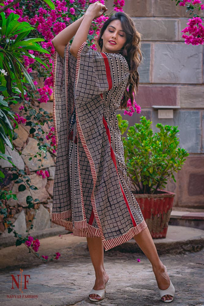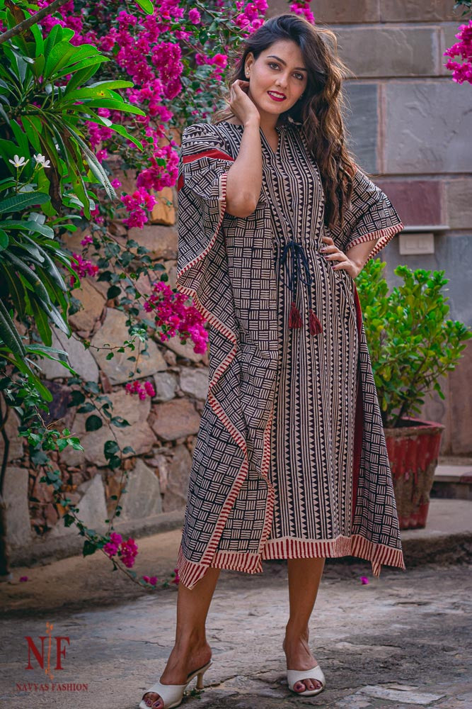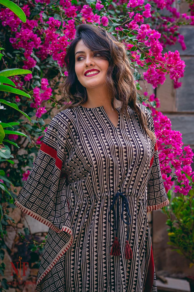 Beautiful bagru red and black block printed kaftan dress with a drawstring and loose sleeves to give trendy looks.