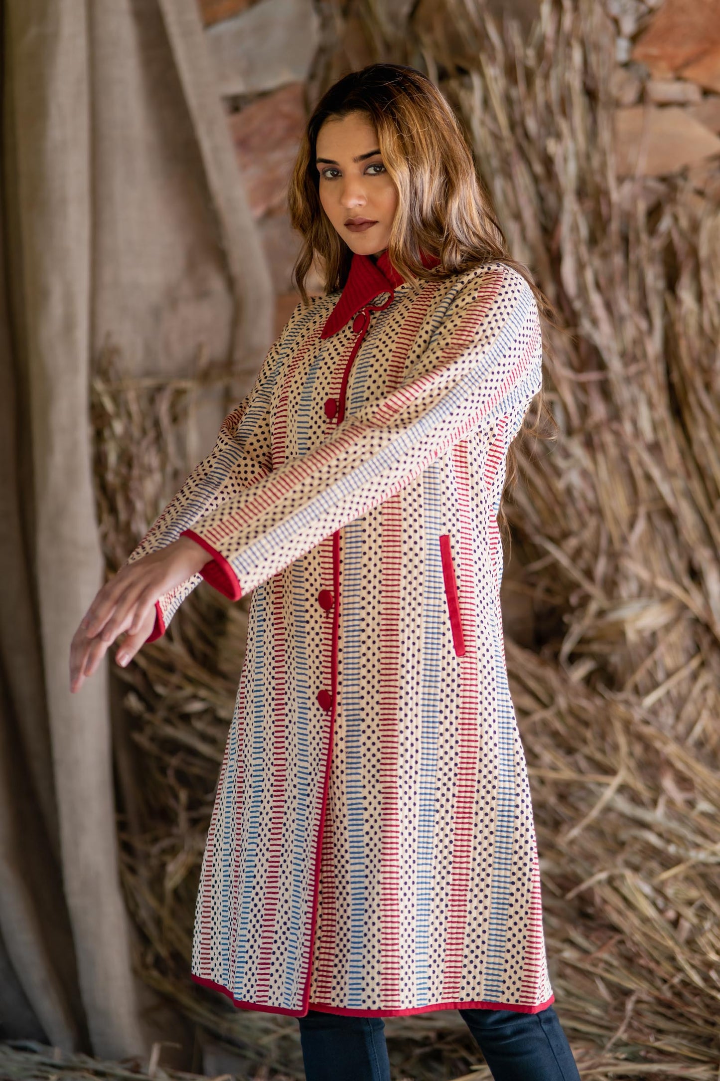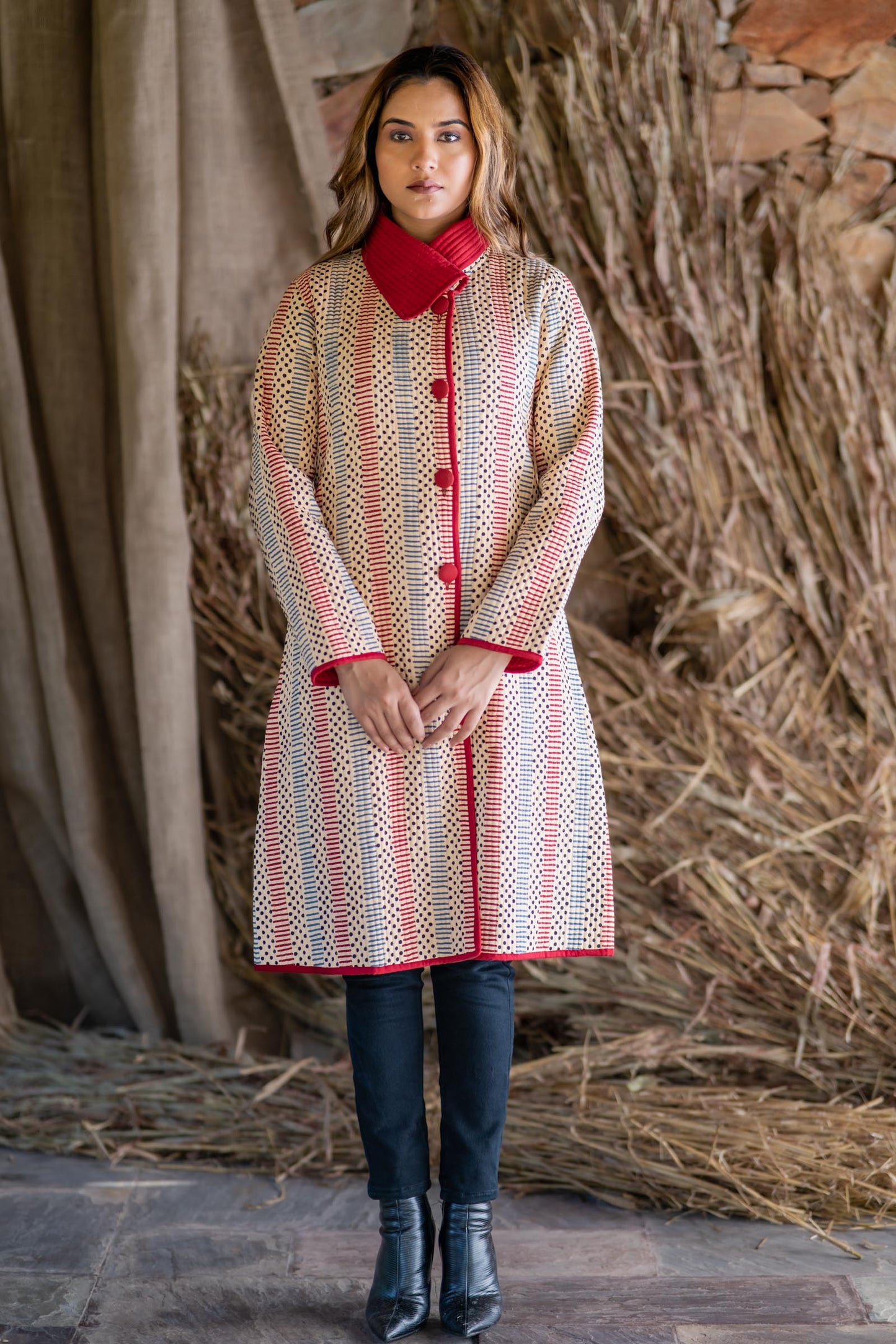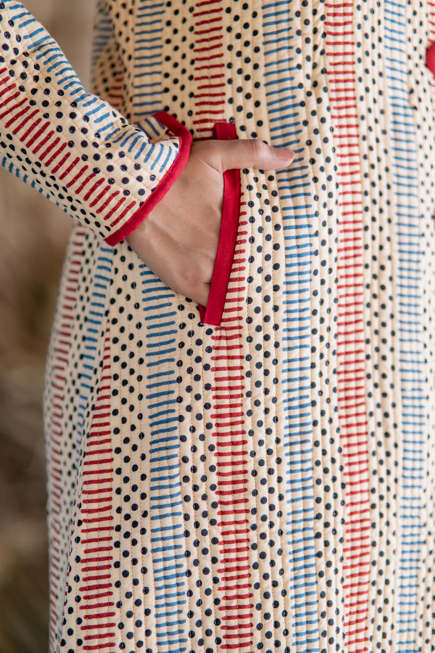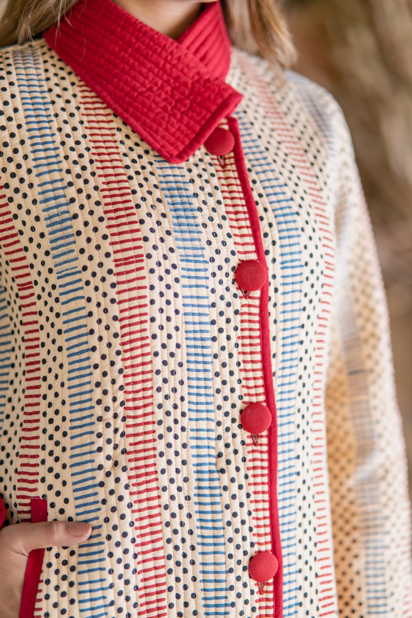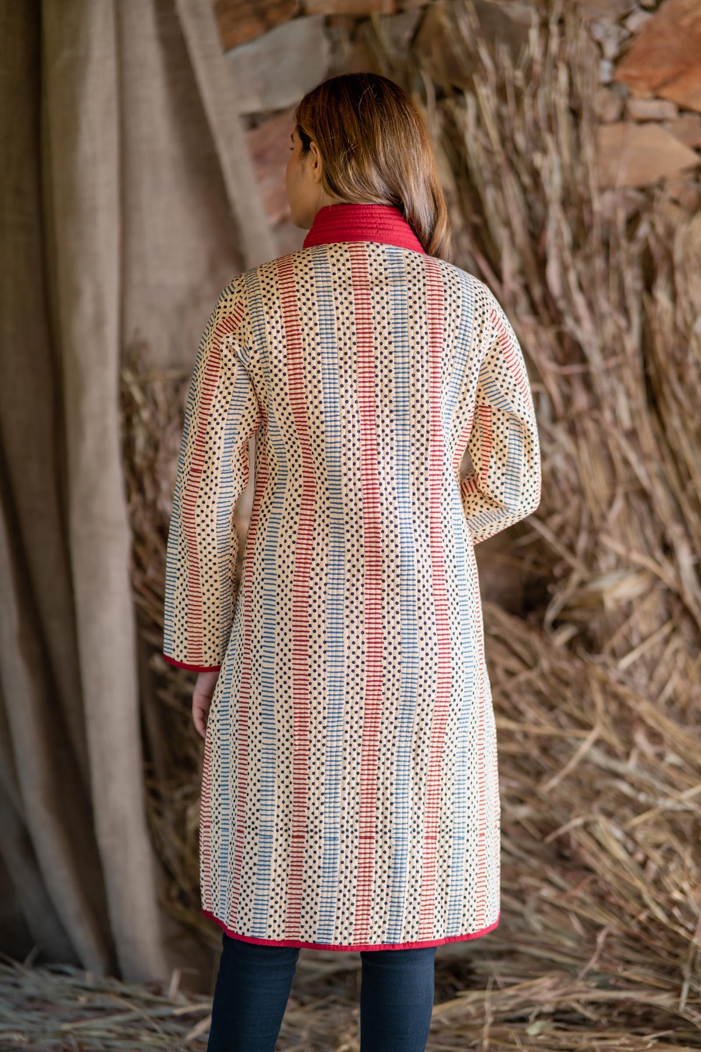 100% cotton bagru printed quilted bukhara jacket in beige and red color combination.