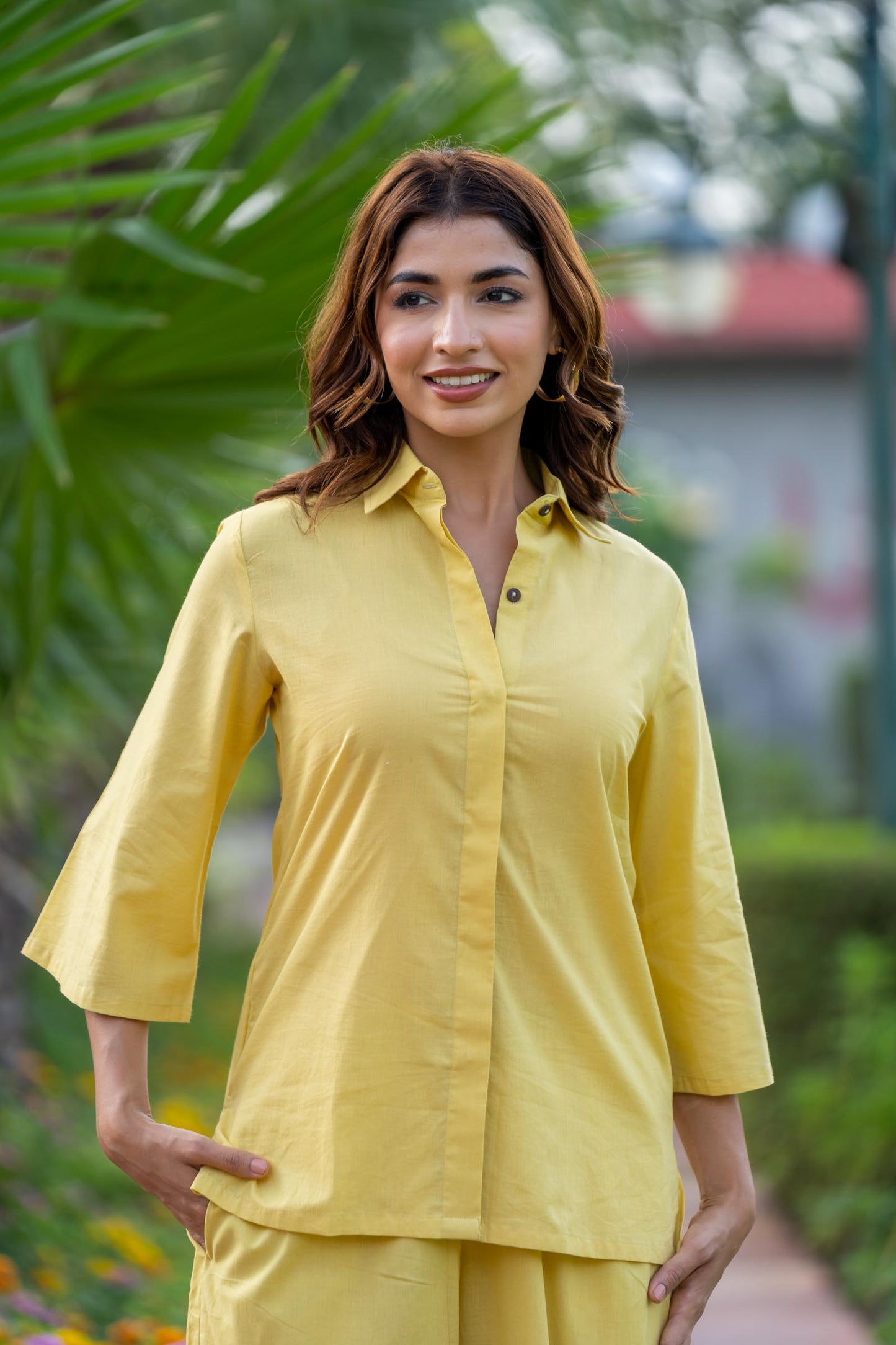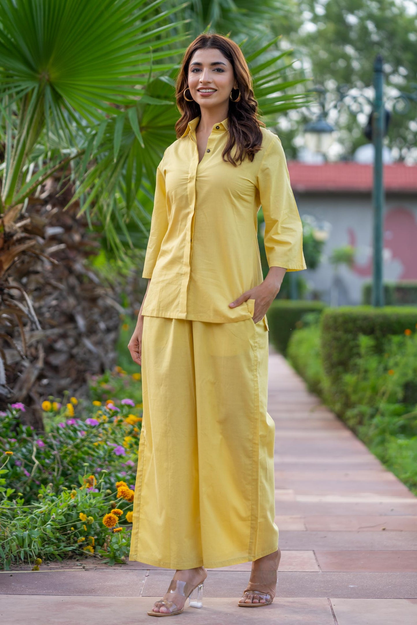 Style yourself with plain yellow shirt style top and palazzo set.