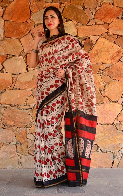 Block Print Cotton Silk Sarees in black and red with a zari border along the length. This stunning hand made block print cotton silk saree will make you look more trendy.Buy hand block printed cotton silk sarees online.