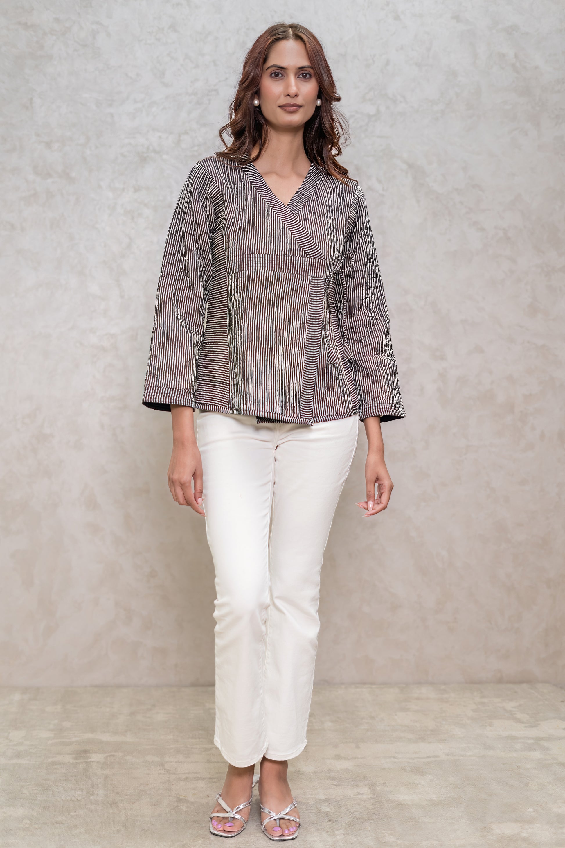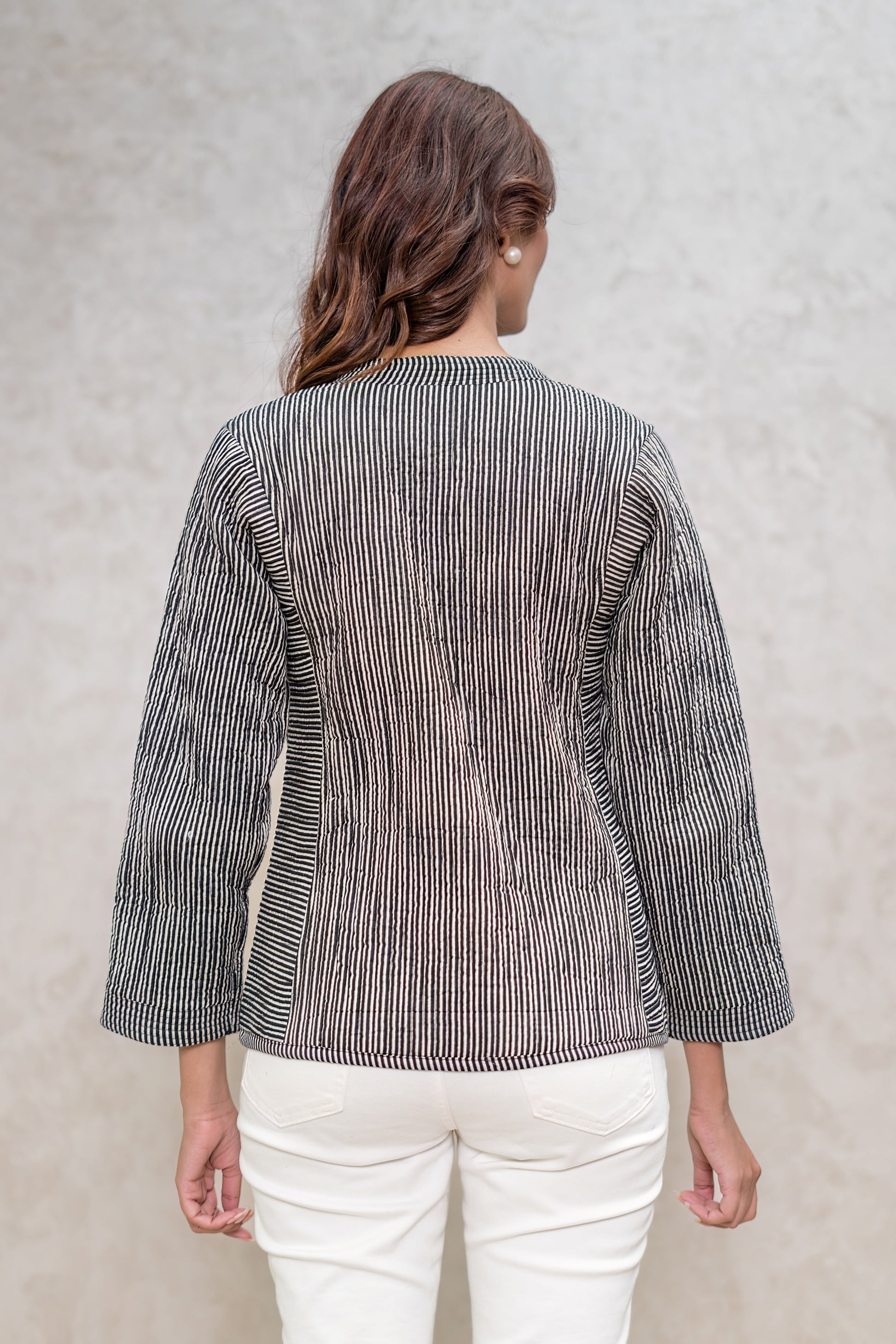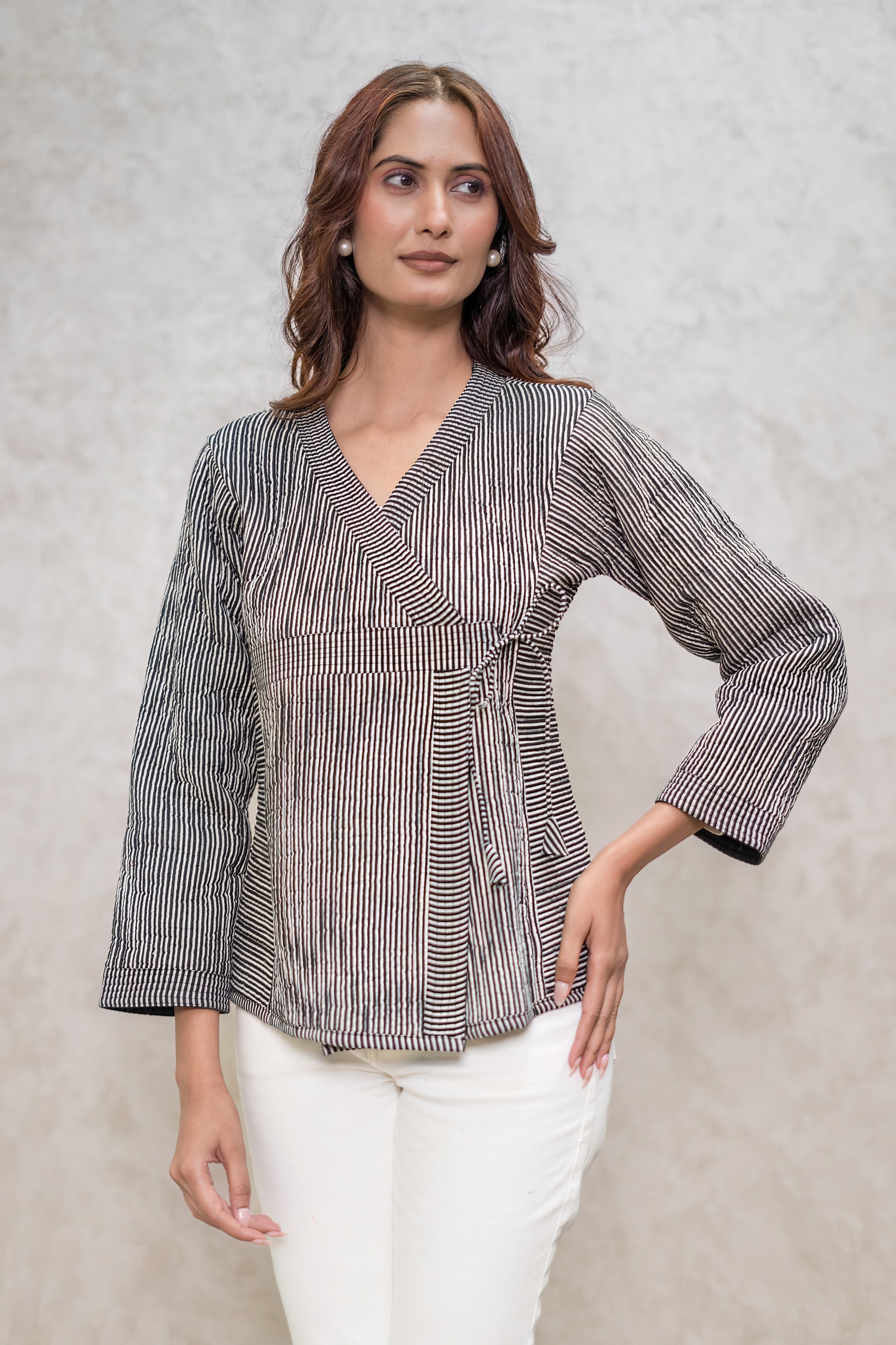 Beautiful bagru striped hand block printed angrakha style quilted jacket for stylish winters with comfortable fit.