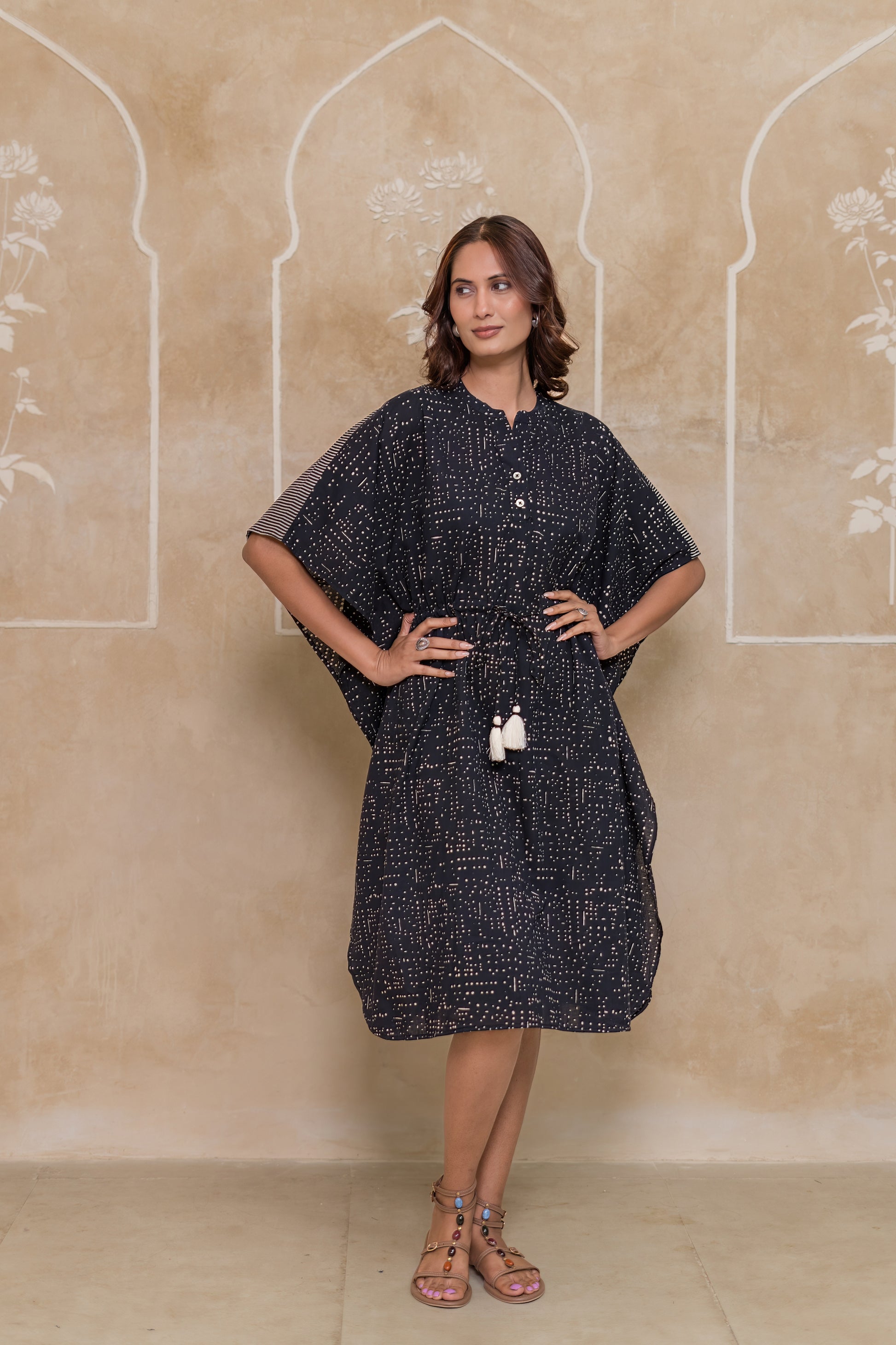 Buy this black hand block printed knee length kaftan dress for casual outings. This pure cotton kaftan dress has drawstring at the waist for the fit adjustments .