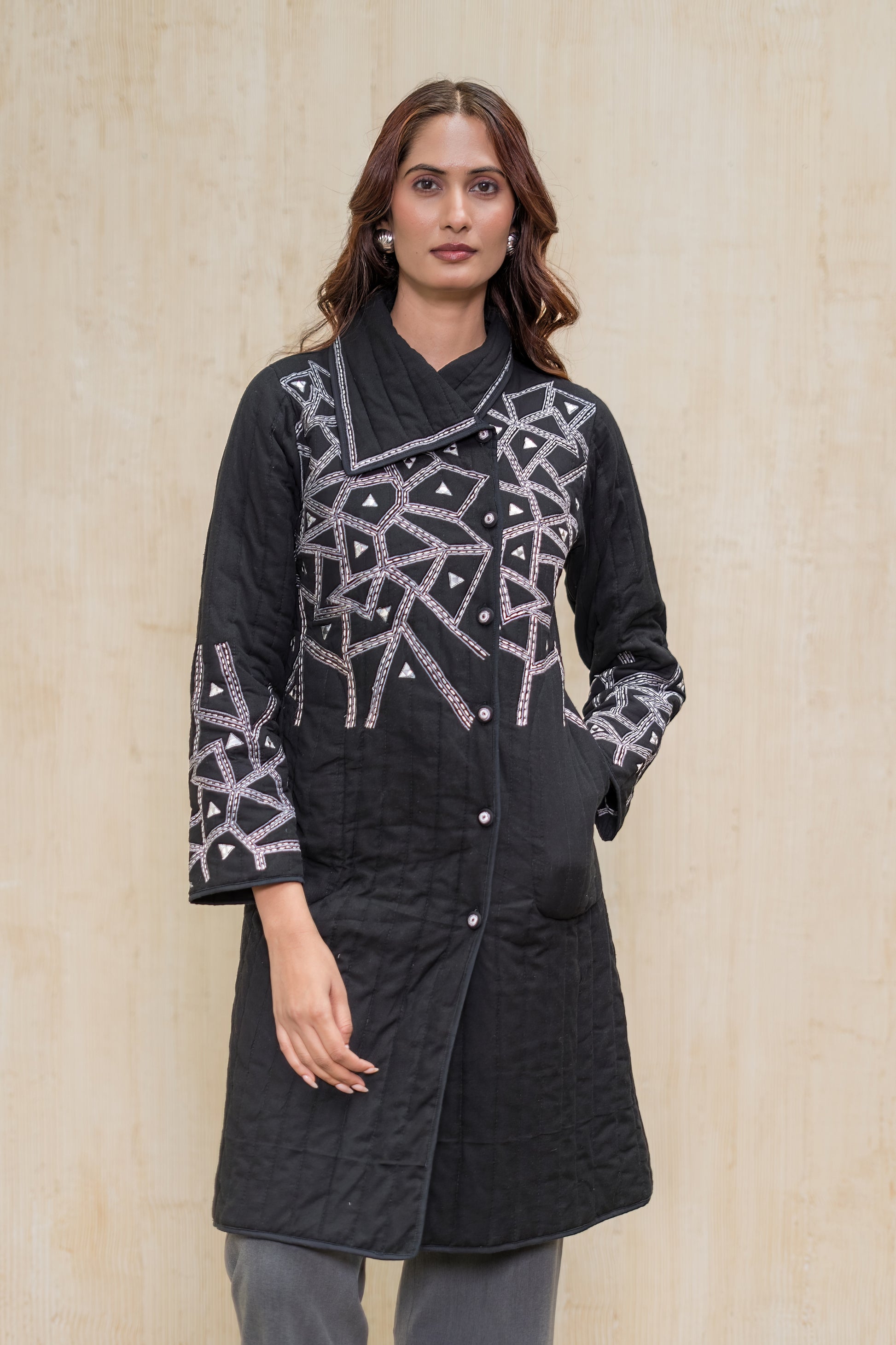 Beautiful hand embroidered quilted coat with a wide collar is a must buy for all the fashion lovers. Hand embroidery with mirror work adds beauty to the piece.