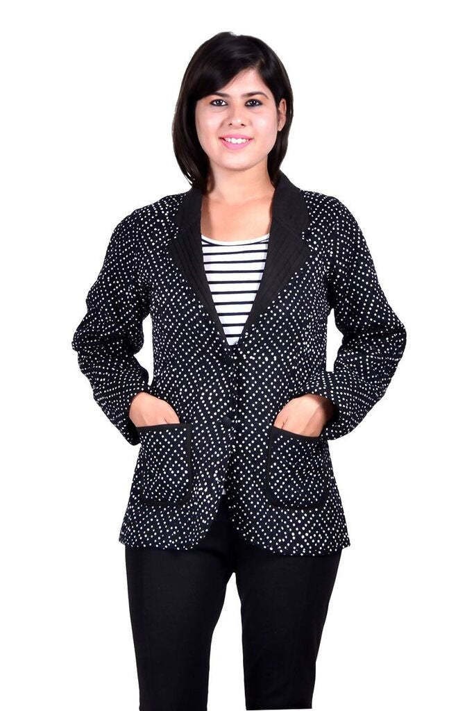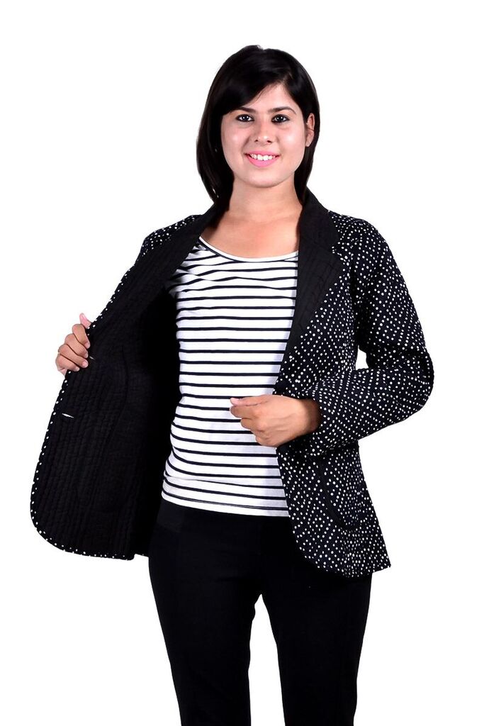 Black white dotted print quilted jacket for women has its own place among trend setters around the world. Unique color and traditional block printed design is what it makes it so special for everyone.