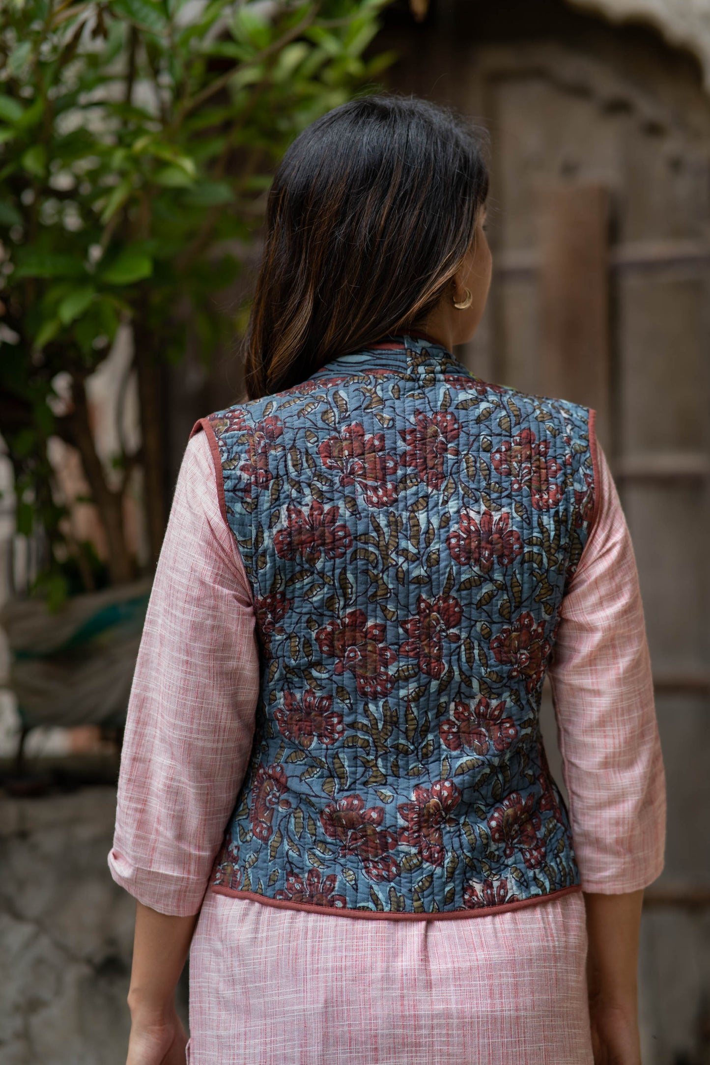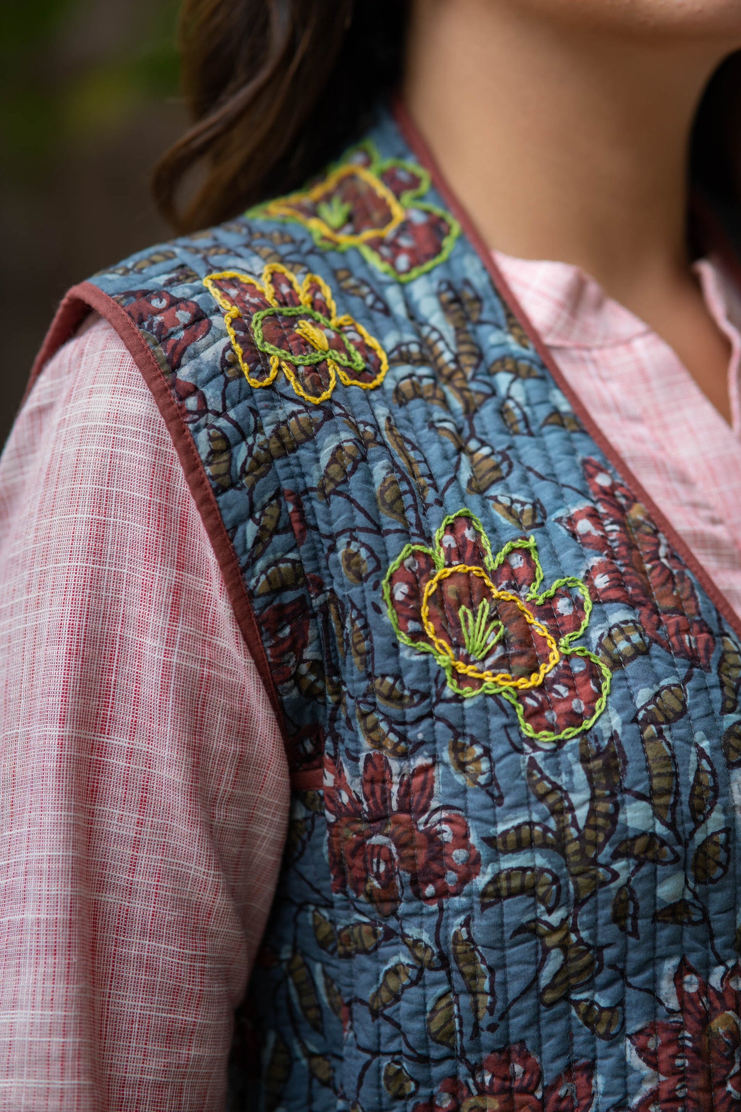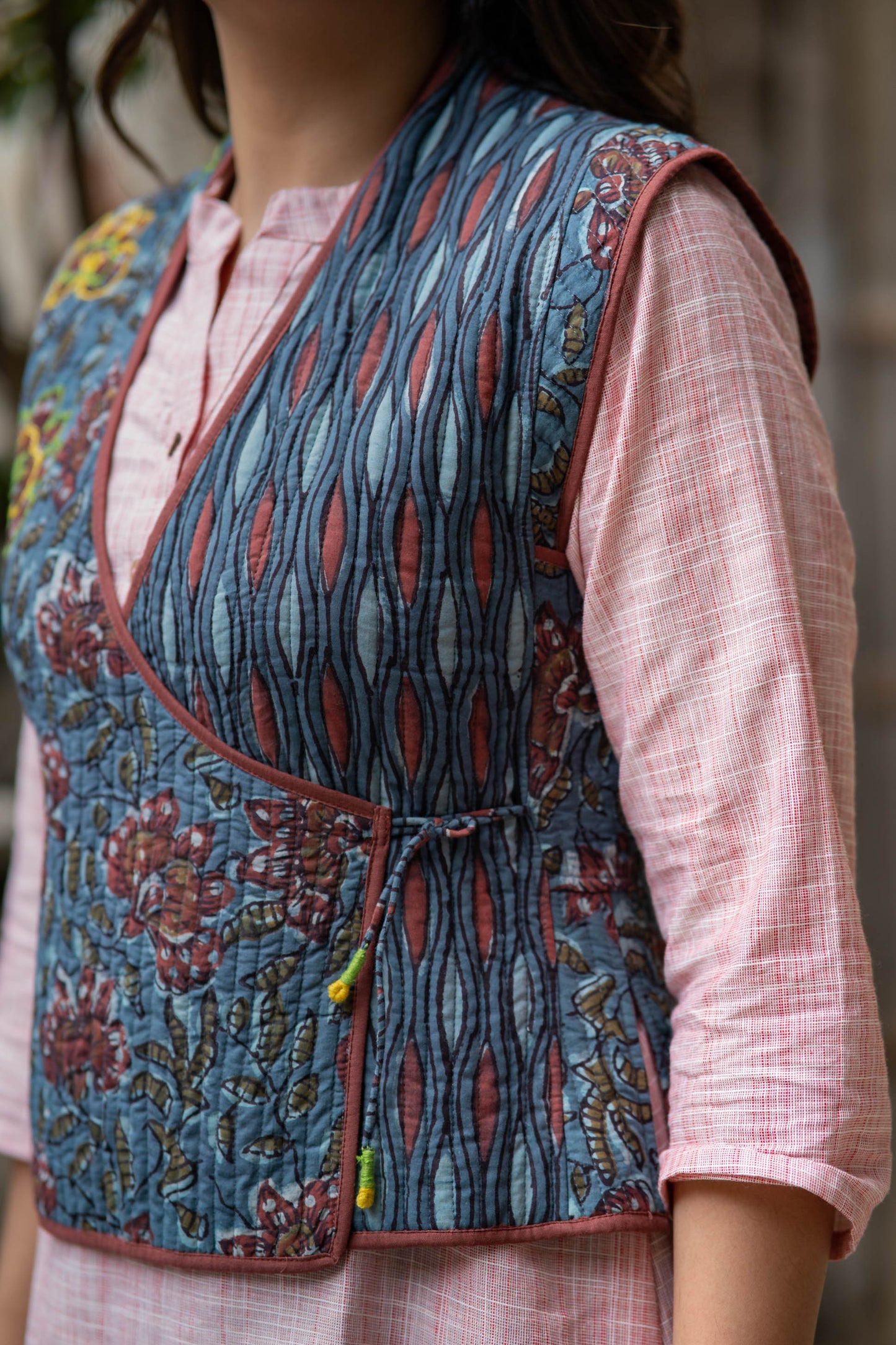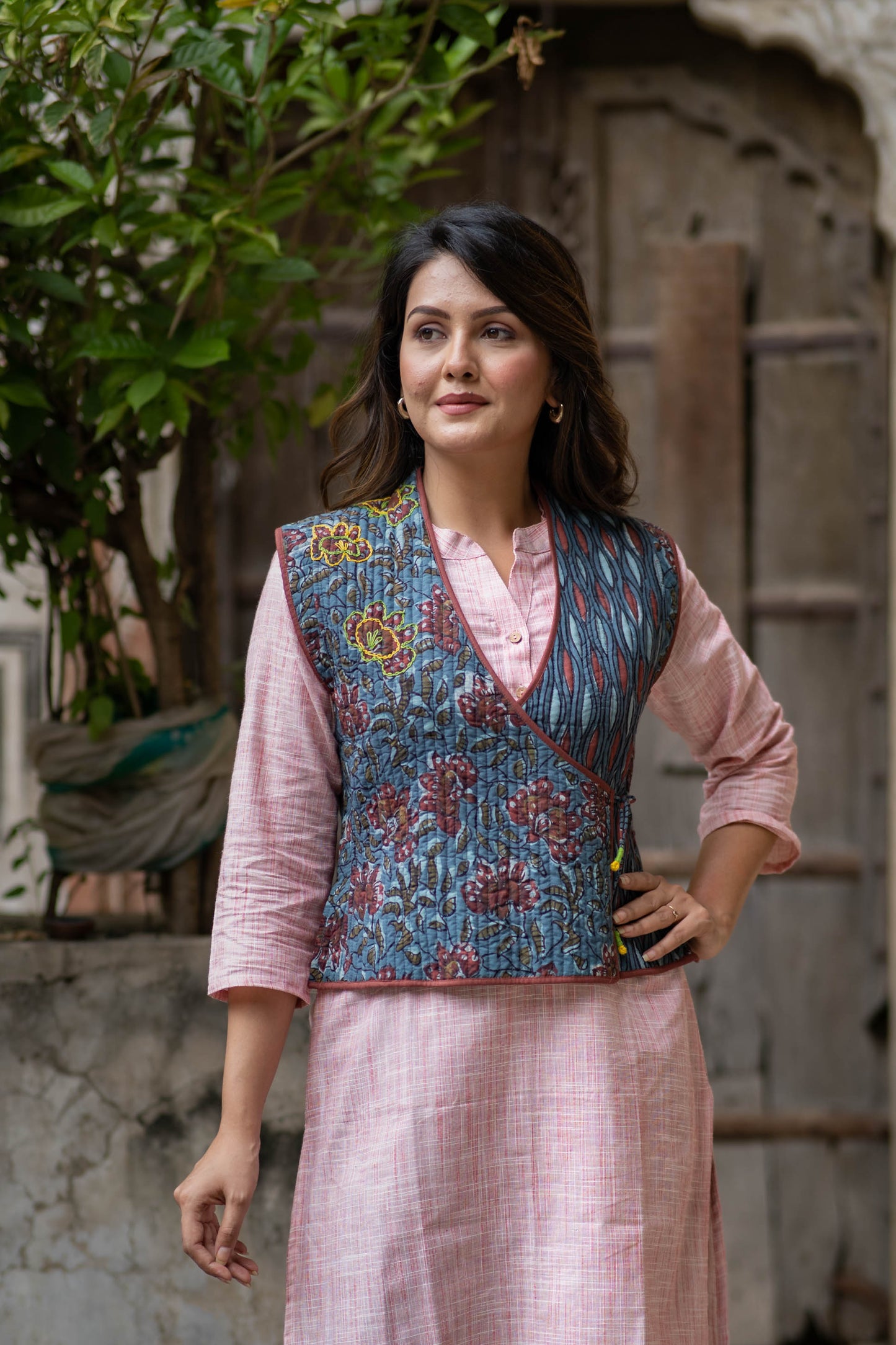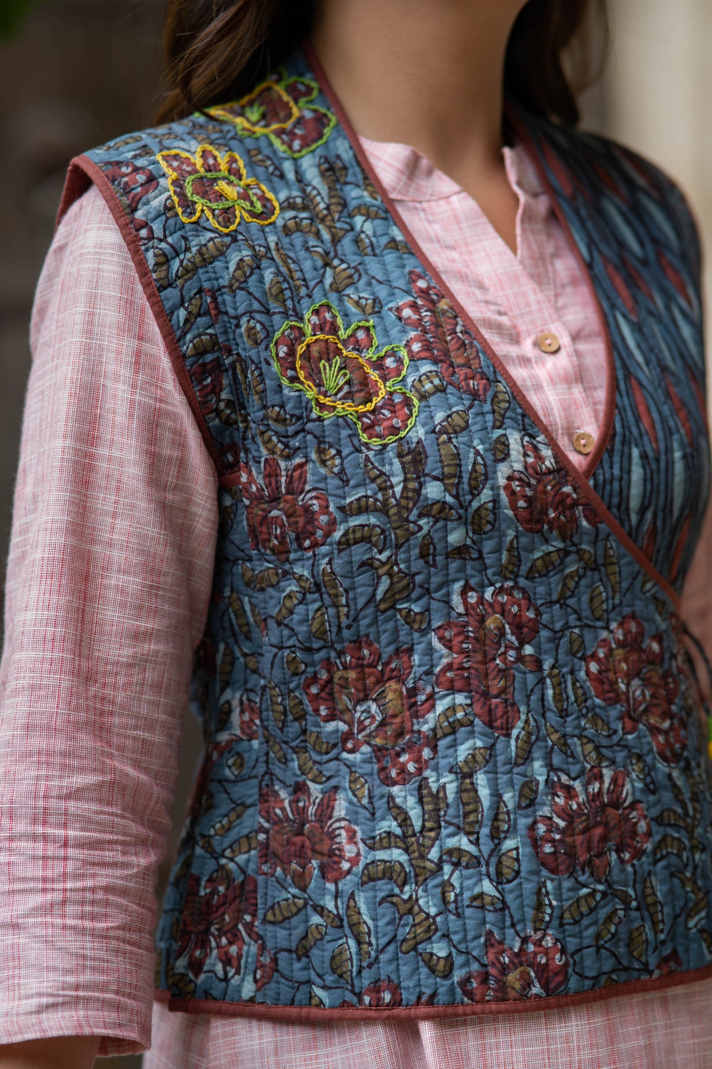 Blue hand block printed angrakha pattern sleeveless jacket for all the fashion lovers.
